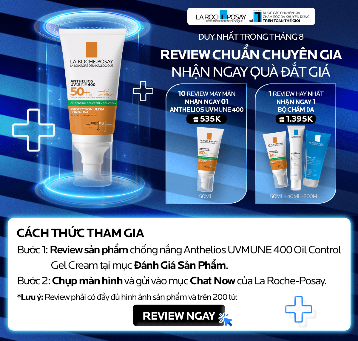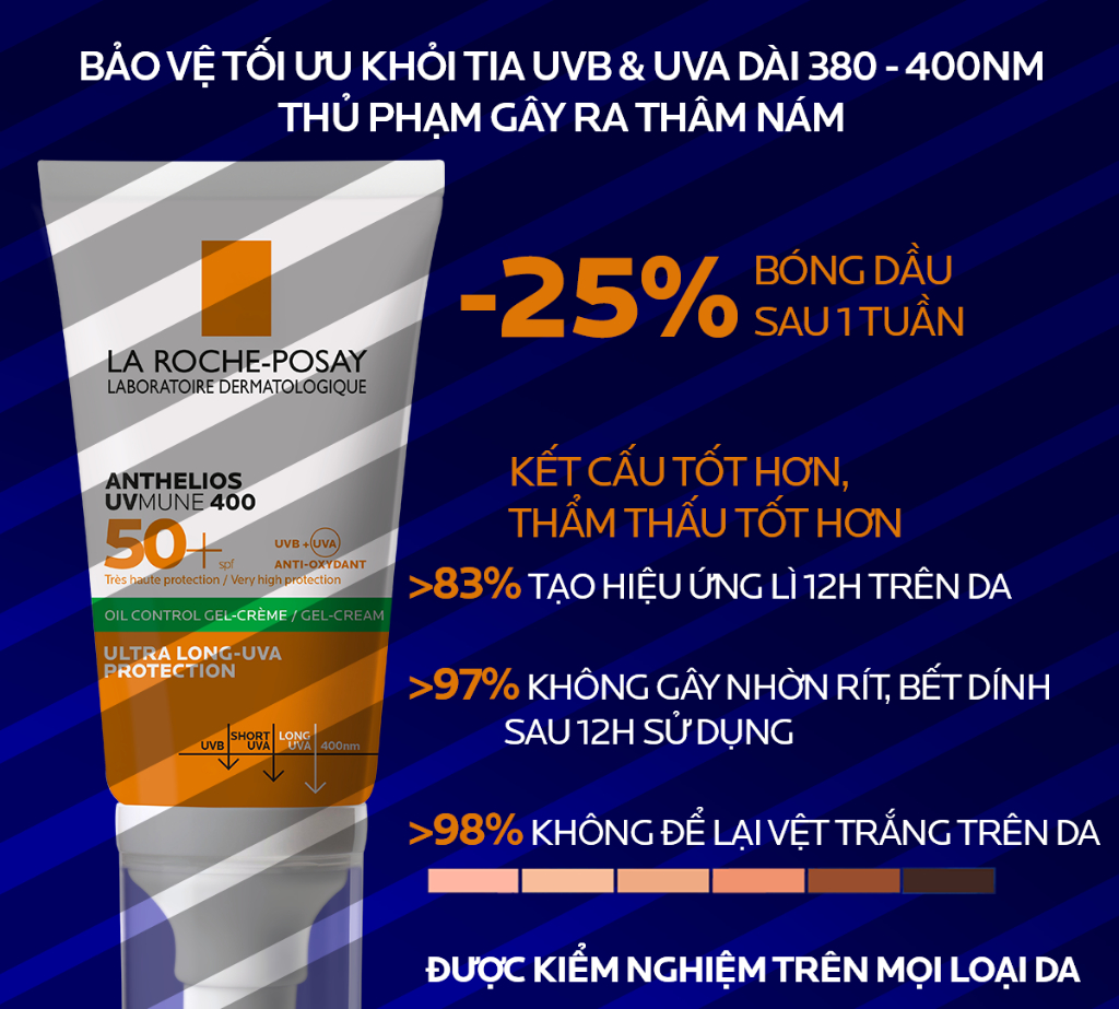 Bao bì sản phẩm có thể thay đổi theo từng thời điểmKem chống nắng giúp bảo vệ da tkhỏi tia UVB & UVA dài và giảm bóng nhờn La Roche-Posay Anthelios UV Mune 400 Oil Control Gel-Cream 50ml là kem chống nắng dành cho da dầu giúp kiểm soát bóng nhờn và bảo vệ da trước tác hại từ ánh nắng & ô nhiễm, ngăn chặn các tác nhân gây lão hóa sớm. Sản phẩm có công thức chống thấm nước thích hợp dùng hằng ngày và cả những hoạt động ngoài trời.THÔNG TIN SẢN PHẨMLoại sản phẩm- Kem chống nắng dành cho da dầu giúp kiểm soát dầu với độ bảo vệ cao SPF 50+.Loại da phù hợp- Phù hợp cho da dầu và da hỗn hợp.- Sử dụng cho da mặt. Độ an toàn- Được kiểm nghiệm dưới sự giám sát của các chuyên gia da liễu.- Không chứa hương liệu, không paraben, không gây bết dính, không để lại vệt trắng, lâu trôi khi sử dụng dưới nước và không gây mụn trứng cá.- Tuyệt đối an toàn với da, đặc biệt là da nhạy cảm.Thành phần- Màng lọc độc quyền MEXORYL 400: Màng lọc UV duy nhất trên thị trường và hiệu quả nhất, kể cả trước những tia UVA dài làm hủy hoại tế bào da với bước sóng 380-400nm. Ngăn chặn hiểu quả của thâm nám da- Hoạt chất AIRLICIUM: Với 99% không khí và 1% silica, hợp chất này có khả năng kháng mồ hôi vượt trội, tạo ra một lớp finish lì và giảm thiểu bã nhờn.ƯU ĐIỂM NỔI BẬT- Kết cấu dạng kem gel, thẩm thấu tức thì, mang lại cảm giác khô thoáng, không để lại vệt trắng.- Kiểm soát bã nhờn & mồ hôi giúp mang đến một cảm giác “sạch” cho làn da đến 12h.- Bảo vệ da trước những tác hại từ ánh nắng & ô nhiễm: lão hóa sớm, đốm nâu, kích ứng ánh nắng.- Độ chống nắng cao nhất SPF 50+ bảo vệ da tối ưu dưới ánh nắng.- Chống nắng phổ rộng với nhiều màng lọc tia UV bảo vệ da trước ngay cả tia UVA dài.HIỆU QUẢ SỬ DỤNG-25% bóng dầu sau 1 tuầng> 83% tạo hiệu ứng lì 12h trên da> 97% không gây nhờn rít, bết dính sau 12h sử dụng> 98% không để lại vệt trắng trên daHƯỚNG DẪN SỬ DỤNG- Thoa kem trước khi tiếp xúc với ánh nắng 20 phút.- Lấy một lượng sản phẩm vừa đủ và chấm 5 điểm trên mặt (trán, mũi, cằm và hai bên má) sau đó thoa sản phẩm theo chiều từ trong ra ngoài và trên xuống dưới.THÔNG TIN THƯƠNG HIỆULa Roche-Posay là nhãn hàng dược mỹ phẩm đến từ Pháp trực thuộc tập đoàn L’Oreal đã hoạt động được hơn 30 năm, phối hợp nghiên cứu với các bác sĩ da liễu trên toàn thế giới cho ra đời các sản phẩm dưỡng da hướng đến thị trường sản phẩm dành cho da nhạy cảm, ngoài ra còn có dòng sản phẩm dành cho trẻ em. Thành phần nổi bật xuất hiện trong các sản phẩm của La Roche-Posay (LRP) là nước suối khoáng – thermal spring water. Tất cả những sản phẩm thuộc La Roche Posay đều được thử nghiệm lâm sàng và đánh giá khách quan từ bệnh viện Saint Jacques-Toulouse. Quy trình bào chế của sản phẩm cũng rất nghiêm ngặt mang lại cho người sử dụng vẻ đẹp tự nhiên và rất an toàn.HSD: 03 năm kể từ NSXNSX: Xem trên bao bìXuất xứ thương hiệu: PhápNơi sản xuất: Pháp