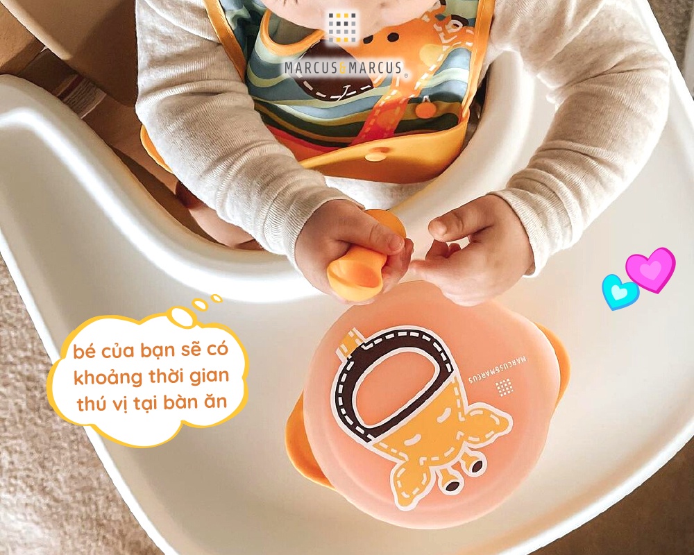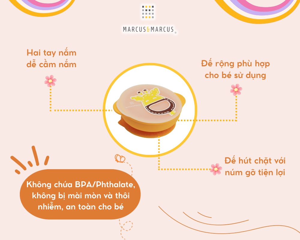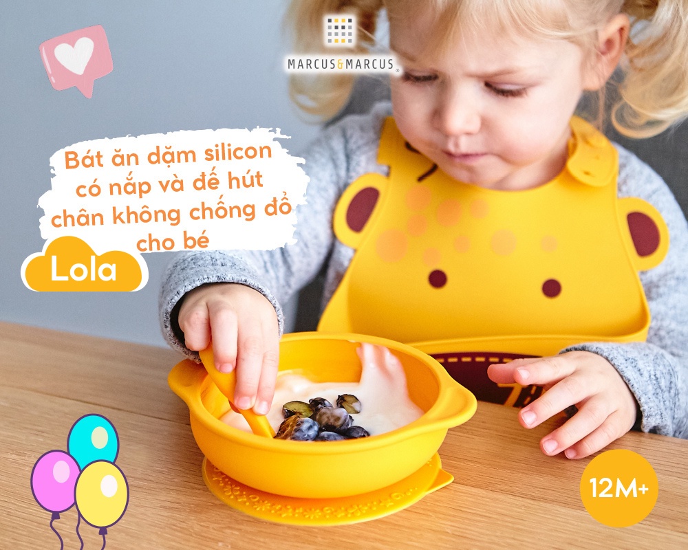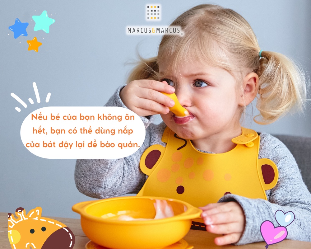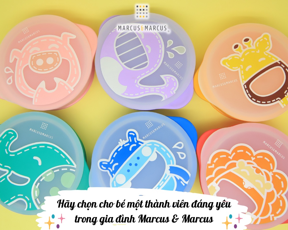 ? Khác biệt vượt trội của bát ăn dặm silicon có nắp và đế hút chân không chống đổ Marcus & MarcusBát ăn dặm silicon có nắp và đế hút chân không chống đổ Marcus & Marcus nổi bật không chỉ nhờ chất lượng vượt trội mà còn được các bé đặc biệt yêu thích nhờ thiết kế thông minh phù hợp với giai đoạn phát triển của bé, màu sắc tươi sáng cùng họa tiết, tạo hình các con thú cưng dễ thương giúp bé hứng thú với bữa ăn và khuyến khích bé ăn uống độc lập.● An toàn và thân thiện môi trườngBát ăn dặm silicon có nắp và đế hút chân không chống đổ Marcus & Marcus được làm từ 100% silicon nguyên chất dùng trong lĩnh vực thực phẩm, khả năng chịu nhiệt khắc nghiệt từ -20 độ C đến 220 độ C, không bị biến dạng, chống mài mòn, không thôi nhiễm, chống ô-xy hóa, không phản ứng với các tác nhân bên ngoài, không chứa bất kỳ thành phần độc hại (BPA, Phthalates, …), đảm bảo an toàn tuyệt đối cho bé từ sơ sinh trong suốt quá trình sử dụng.Với khả năng sử dụng bền lâu, chất liệu silicon có thể tái chế, không gây ô nhiễm môi trường, sản phẩm Marcus & Marcus thân thiện với môi trường và giúp bạn tiết kiệm hơn về lâu dài.● Màu sắc tươi sáng dành riêng cho trẻMàu sắc không chỉ đóng vai trò quan trọng trong thẩm mỹ mà còn có ảnh hưởng tích cực đến cảm xúc, nhận thức, tăng cường khả năng học tập, khả năng quan sát, kích thích sự sáng tạo của trẻ. Bát ăn dặm silicon có nắp và đế hút chân không chống đổ Marcus & Marcus được thiết kế với 6 màu sắc cơ bản, sinh động, bắt mắt cho bé lựa chọn (vàng, đỏ bordeau, xanh lá, xanh dương, hồng, tím), bé sẽ cảm thấy cuốn hút và muốn tìm hiểu khám phá. ● Thiết kế thân thiện với bé, giúp bé hứng thú với bữa ănBát ăn dặm silicon có nắp và đế hút chân không chống đổ Marcus & Marcus được thiết kế hiện đại, tiện lợi, đặc biệt dễ dàng sử dụng, khuyến khích bé tập ăn và tham gia tích cực vào bữa ăn, đồng thời rèn luyện kỹ năng cầm nắm của bé. Hình dáng và họa tiết theo chủ đề những con vật tinh nghịch, ngộ nghĩnh như sư tử Marcus, hươu cao cổ Lola, heo con Pokey, cá voi Willo, voi con Ollie và hà mã Lucas với màu sắc đa dạng, sinh động làm cho bé thích thú hơn với mỗi bữa ăn. Bé sẽ được khám phá chơi đùa với đồ ăn thỏa thích, kích thích sự thèm ăn và giúp bé ăn ngon miệng hơn.