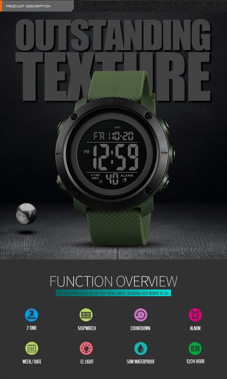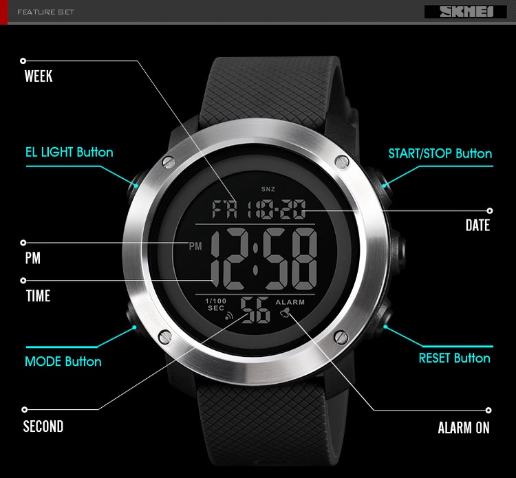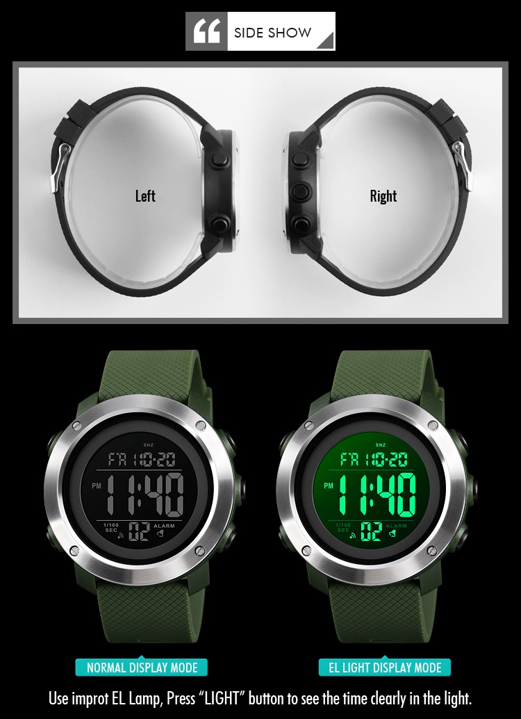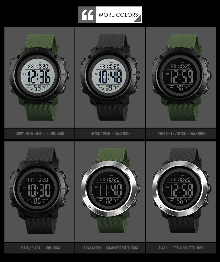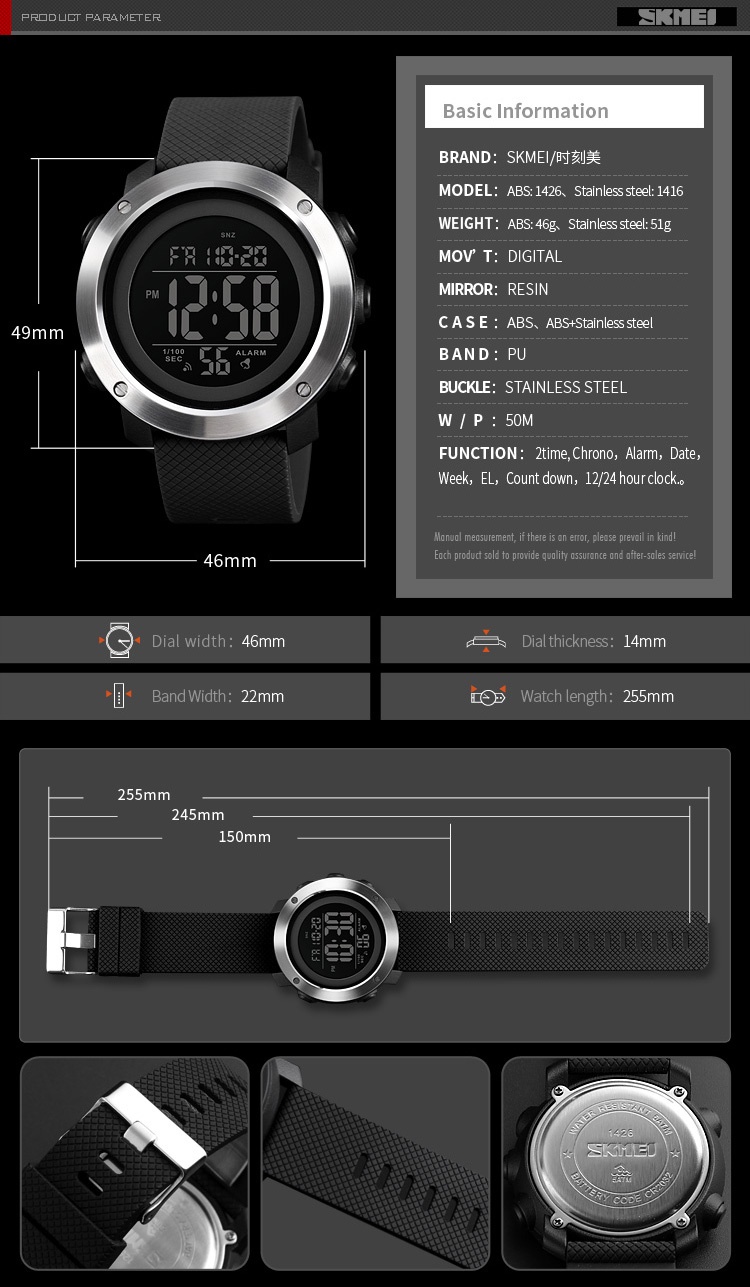Kích thước mặt:TrònKích thước dây (chiều dài/ chiều rộng):25,5cm/22mmChống nước:Chống nướcThời gian bảo hành:noLoại sản phẩm: Đồng hồ đeo tay kỹ thuật sốLoại móc khóa: Khóa càiHình dạng vỏ: TrònTính năng: Chronograph, Đồng hồ bấm giờ, Hiển thị tuần, Bơi lội, Báo thức, Lịch hoàn chỉnh, Màn hình LED, Nhiều múi giờ, Chống nước, Đèn nềnChất liệu mặt đồng hồ: NhựaPhong cách: Thời trang & Thường ngàySố mô hình: 1426Độ dày vỏ: 14mmĐộ sâu kháng nước: 5BarChiều dài dây: 25,5cmChất liệu vỏ: ABSChất liệu dây đeo: PUĐường kính quay số: 46mmThương hiệu: SKMEIChiều rộng dải: 22mmKiểu máy: Kỹ thuật sốGói hàng bao gồm: 1 * đồng hồ1 * hướng dẫn sử dụng.Không có hộp ————————————————————————•Dịch Vụ:1.Chúng tôi là nhà sản xuất ban đầu.2.Tất cả các sản phẩm là 100% mới và nguyên bản.3.Chúng tôi cam kết cung cấp cho bạn sản phẩm với chất lượng cao nhất với giá cả hợp lý. 4.Chắc chắn tận tâm để cung cấp trải nghiệm khách hàng tốt! 5.Sự hài lòng của khách hàng là mục tiêu theo đuổi quan trọng đối với chúng tôi như mọi khi. 6.Mọi người có thể yên tâm mua hàng của chúng tôi để nhận được sản phẩm chính hãng với dịch vụ chăm sóc khách hàng tuyệt vời của chúng tôi.• Đảm bảoHoàn lại tiền hoặc gửi lại hoặc bất kỳ giải pháp tốt nhất nào cho bất kỳ sản phẩm bị hư hỏng hoặc lỗi nào.————————————————————————