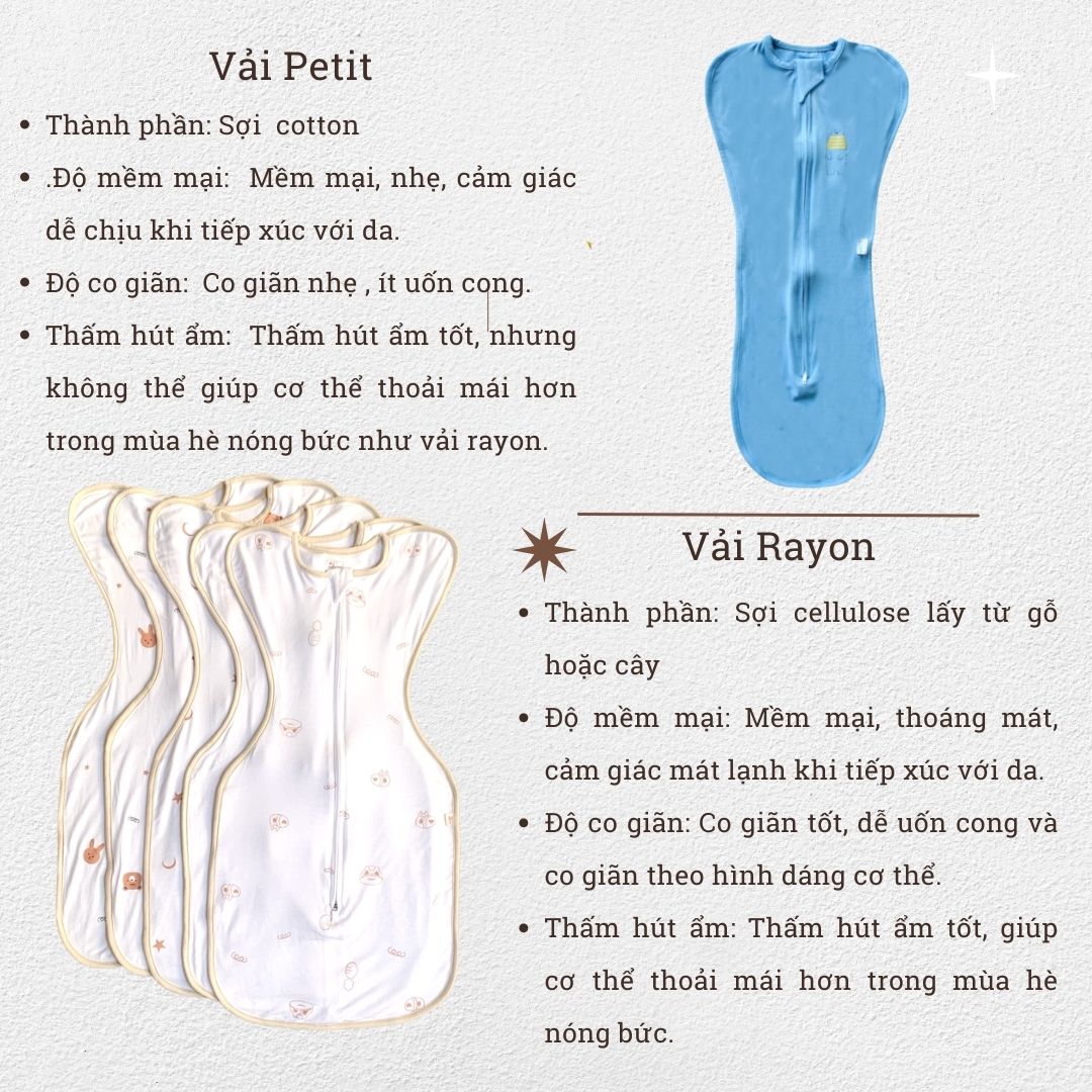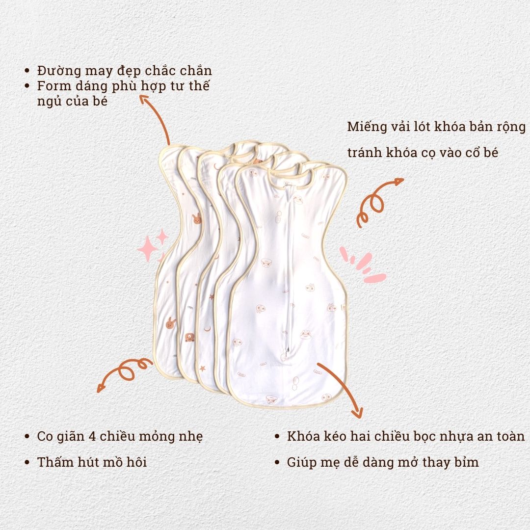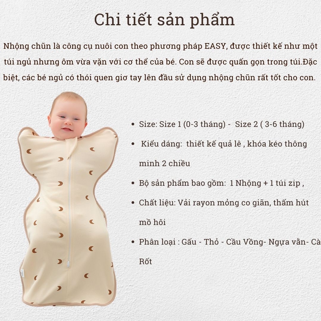 Tự hào sản xuất tại Việt Nam??THÔNG TIN SẢN PHẨM- Tên sản phẩm: Nhộng Chũn Cho Bé Ngủ Ngon, Tránh Giật Mình Chất Cotton Mềm Mại Co Giãn Đàn Hồi Cực Tốt- Chất liệu: Vải rayon là một loại vải tổng hợp được sản xuất từ cellulose, một loại chất liệu tự nhiên chủ yếu được lấy từ cây gỗ hoặc cây bông. Quá trình sản xuất rayon bao gồm nhiều bước xử lý hóa học, trong đó cellulose được giải phóng từ nguyên liệu thô và sau đó được xử lý để tạo thành sợi vải. Tùy thuộc vào quy trình sản xuất, vải rayon có thể có nhiều loại khác nhau, bao gồm viscose rayon, modal rayon, lyocell rayon và nhiều loại khác.Một trong những đặc điểm nổi bật của vải rayon là độ mềm mại và thoáng khí của nó. Vải rayon có cấu trúc sợi mềm mại và thoáng khí, giúp cho quần áo và chăn mền từ rayon rất thoải mái khi mặc vào. Bên cạnh đó, vải rayon cũng có độ mịn và mềm mại, không gây kích ứng cho da, vì vậy thường được sử dụng để làm quần áo, đồ chơi và chăn mền cho trẻ sơ sinh.Ngoài ra, vải rayon còn có nhiều ưu điểm khác, bao gồm:Dễ chịu cho da: Vải rayon không chứa các hóa chất gây kích ứng da như polyester hay nylon, do đó rất thích hợp cho những người có da nhạy cảm.Dễ dàng chăm sóc: Vải rayon dễ dàng giặt ủi và duy trì độ bền sau khi giặt.Đa dạng về màu sắc: Vải rayon có khả năng hấp thụ màu rất tốt, vì vậy có thể sử dụng nhiều loại màu sắc khác nhau. Vải petit (còn được gọi là vải poplin) là một loại vải bằng bông với cấu trúc kết dệt tăng cường, tạo ra một bề mặt mịn và đặc trưng với những sợi dọc và ngang khác nhau. Vải petit thường được sử dụng để may các trang phục như áo sơ mi, váy hoặc quần âu, và nó được ưa chuộng bởi tính thoáng khí, thoải mái và độ bền.Cấu trúc kết dệt tăng cường của vải petit tạo ra một sợi bền, vì vậy nó thường được sử dụng để may những bộ đồ thường xuyên sử dụng. Ngoài ra, vải petit cũng có độ mịn và bề mặt đẹp, tạo ra một cảm giác thoải mái và thích hợp để sử dụng trong mùa hè. Vải petit có thể có nhiều màu sắc và in ấn khác nhau, giúp cho người sử dụng có nhiều sự lựa chọn khi chọn trang phục.Tuy nhiên, vải petit có thể nhăn và co lại sau khi giặt và sử dụng nhiều lần, do đó cần được chăm sóc kỹ càng. Để duy trì độ bền và màu sắc của vải petit, nên giặt trong nước lạnh và không sử dụng hóa chất tẩy. Ngoài ra, cần phơi khô vải petit trong bóng râm- Thích hợp cho các bé trai, bé gái cân nặng từ 3- 09kg;- Độ tuổi: 1 tháng - 6 tháng;?? HƯỚNG DẪN CHỌN SIZEtúi ngủ cho bé sơ sinh có 2 size:- Size: 3 - 5kg;- Size: 5 -7kg; LƯU Ý : KHI BÉ BỤ CÂN HƠN NHẮN TIN CHO SHOP ĐỂ TƯ VẤN SIZE VÀ TƯ VẤN CHẤT VẢI??ƯU ĐIỂM SẢN PHẨM NHỘNG CHŨN GIÚP BÉ NGỦ NGON NHƯ THẾ NÀO- Khi ở trong bụng mẹ, bé quen với không gian chật hẹp, hai tay và chân được giữ chặt- Vì vậy ngay khi bé chào đời, các bác sĩ phải dùng tã để quấn chặt bé rồi mới ủ bé ngủ- Khi ra ngoài, tay chân bé không còn bị giữ chặt nữa nên nếu ba mẹ không để ý giữ tay chân bé thì bé sẽ rất hay giật mình lúc ngủ- Nhộng chũn ôm chặt sẽ giúp bé không giật mình ngủ ngon hơn, đủ giấc hơn, giảm quấy khóc và không ảnh hưởng đến sức khỏe của béSỬ DỤNG NHỘNG CHŨN RẤT TIỆN LỢI- Nhộng chũn có khóa kéo 2 chiều, mẹ có thể kéo khóa thay bỉm mà không làm bé tỉnh giấc- Nhộng chũn có thiết kế “cửa sổ” để mẹ có thể kiểm tra nếu có nghi ngờ bé ị- Kén ngủ cho bé được thiết kế dựa trên loại vải co giãn, thoáng mát, tay bé có thể cử động tự do không dập vào mặt làm tỉnh giấc- Đường may tỉ mỉ, bền đẹp: Từng đường viền may được thực hiện tỉ mỉ và tinh tế vừa đẹp mắt vừa đảm bảo độ bền hoàn hảo với thời gian. Các đầu chỉ thừa được xử lý gọn gàng tránh gây vướng chỉ vào đầu ngón tay bé yêu, tuyệt đối an toàn khi mặc.??QUY ĐỊNH ĐỔI TRẢ1. Điều kiện áp dụng (trong vòng 07 ngày kể từ khi nhận sản phẩm):- Khách hàng có video quay lại khi nhận hàng, bóc hàng, kiện phải đủ tem mác gói bọc như ban đầu- Hàng hoá vẫn còn mới, chưa qua sử dụng;- Hàng hoá bị lỗi hoặc hư hỏng do vận chuyển hoặc do nhà sản xuất;2. Trường hợp được chấp nhận: - Hàng không đúng size, kiểu dáng như quý khách đặt hàng;- Không đủ số lượng, không đủ bộ như trong đơn hàng;3. Trường hợp không đủ điều kiện áp dụng chính sách: - Quá 07 ngày kể từ khi Quý khách nhận hàng;- Gửi lại hàng không đúng mẫu mã, không phải sản phẩm của Unbee;- Không thích, không hợp, đặt nhầm mã, nhầm màu,...;Do màn hình và điều kiện ánh sáng khác nhau, màu sắc thực tế của sản phẩm có thể chênh lệch khoảng 3-5%.LƯU Ý : - Quý khách hàng nhận được hàng có thắc mắc vui lòng inbox cho shop trước khi đánh giá sản phẩm - Các mom nhận hàng, ưng sản phẩm cho shop xin 1 đánh giá 5 sao kèm hình ảnh sản phẩm.- Khách yêu đặt hàng vui 