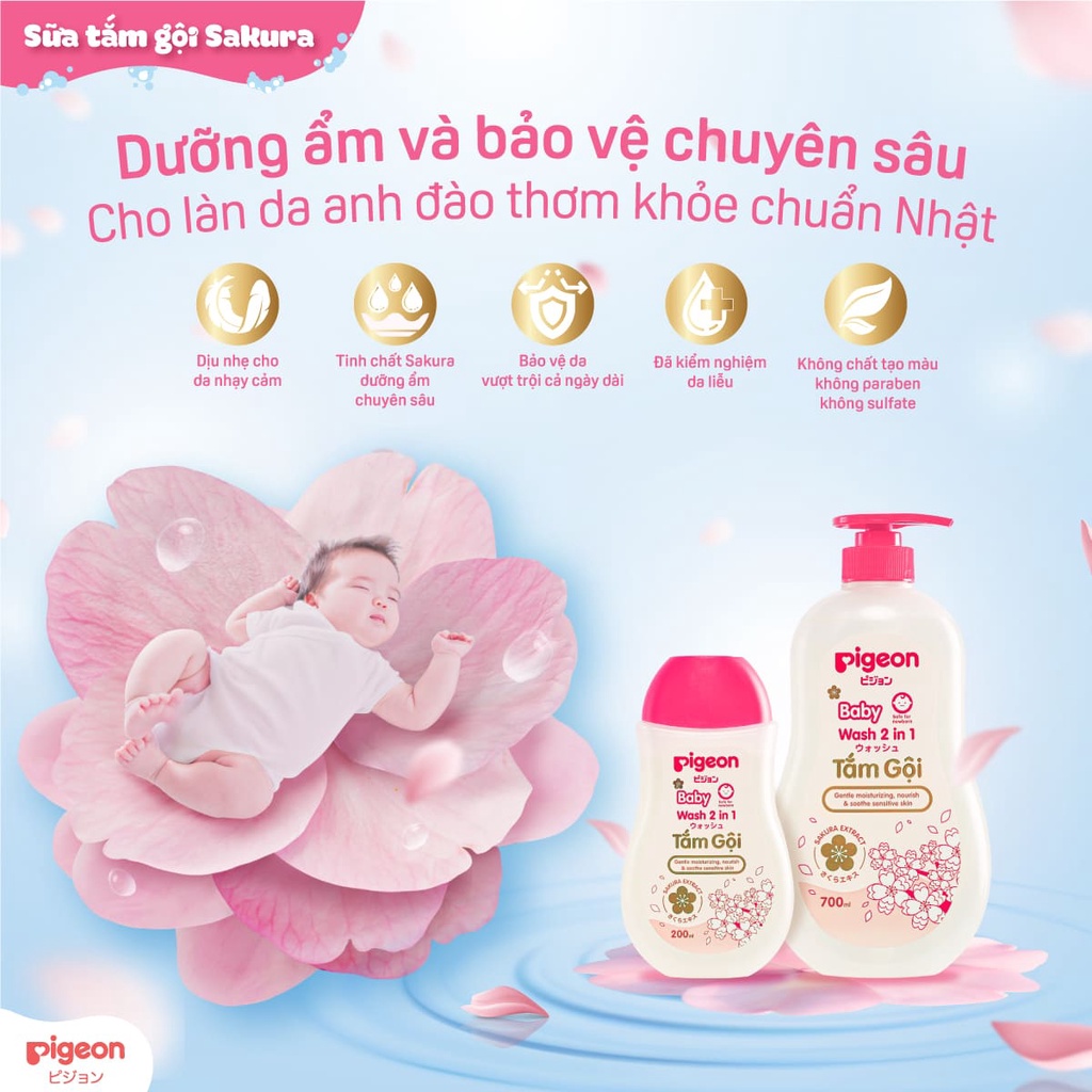 Với chiết xuất từ những cánh hoa anh đào – biểu tượng đặc trưng của Nhật Bản, Sữa tắm gội Sakura là sự kết hợp giữa tinh chất anh đào thơm mát, và vitamin B5 giúp giữ ẩm tuyệt đối.Sản phẩm dành cho trẻ sơ sinh và trẻ nhỏ Sữa tắm gội Pigeon với công thức đến từ Nhật Bản giúp nhẹ nhàng làm sạch, nuôi dưỡng tóc và làn da mỏng manh của bé trở nên khỏe mạnh và mịn màng