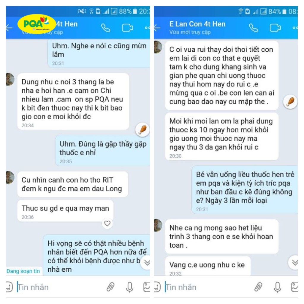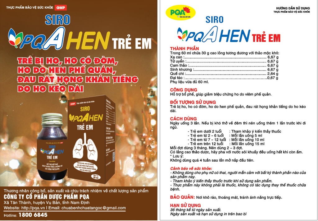 ?THÀNH PHẦN SIRO PQA HEN TRẺ EM?Trong 60ml chứa 30g cao lỏng tương đương với thảo mộc khô:Xạ can: 6.67gTử uyển: 6.67gCam thảo: 6.67gSinh khương: 6.67gQuế chi: 2.64gĐại táo: 0.67gPhụ liệu vừa đủ 60ml.?CÔNG DỤNG & ĐỐI TƯỢNG DÙNG SIRO PQA HEN TRẺ EM?Hỗ trợ bổ phế, giúp giảm triệu chứng ho do viêm phế quảnTrẻ bị ho, ho có đờm, ho do hen phế quản, đau rát họng, khản tiếng do ho kéo dài?CÁCH DÙNG SIRO HEN TRẺ EM PQA?Ngày uống 3 lần. Nếu bị khó thở về đêm thì nên uống thêm 1 lần trước khi đi ngủ.– Trẻ em dưới 2 tuổi : tham khảo ý kiến thầy thuốc– Trẻ em từ 2 – 6 tuổi : Mỗi lần uống 5ml– Trẻ em từ 7 – 12 tuổi : Mỗi lần uống 10ml– Trẻ em trên 12 tuổi : Mỗi lần uống 15mlMỗi đợt dùng 3 tháng. Nên dùng 2-3 đợt?Lưu ý?- Có lắng cao, nên lắc đều uống hết- Không dùng quá 4 tuần sau lần mở nắp đầu tiên?Cảnh báo về sức khỏe:?– Không dùng cho phụ nữ có thai, người mẫn cảm với bất kỳ thành phần nào của sản phẩm– Tham khảo ý kiến thầy thuốc trước khi sử dụng sản phẩm?Chú ý: Sản phẩm này không phải là thuốc và không có tác dụng thay thế thuốc chữa bệnh.?Bảo quản: Nơi khô thoáng tránh ánh sáng?Hạn sử dụng: 36 tháng kể từ ngày sản xuất. Ngày sản xuất và hạn sử dụng in trên bao bì.Số đăng ký: 1202/2020/ĐKSPSố XNQC: 1924/2020/XNQC-ATTP