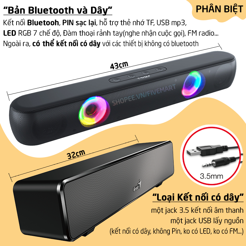★ Có 3 phân loại: Một loại Kết nối bluetooth + dây, 2 loại kết nối chỉ có dây. Vui lòng chọn phân loại muốn mua khi đặt hàng (đã chỉ rõ trên ảnh và mô tả). Fivemart không chịu trách nhiệm nếu bạn đặt nhầm ạ