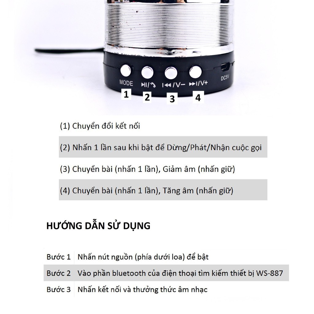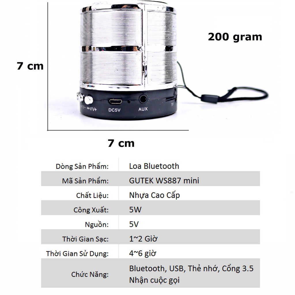 Loa Bluetooth Nghe Nhạc Mini Gutek WS887 Dáng Nhỏ Gọn Cầm Tay Hỗ Trợ Cắm Usb Thẻ Nhớ Giá RẻLoa nghe nhạc mini giá rẻ- Loa bluetooth mini Gutek Ws887 mang đến sự hài lòng cho khách hàng từ hình thức đến âm thanh nhờ thiết kế đẹp mắt, độc đáo, kiểu dáng nhỏ gọn, nhẹ nhàng dễ dàng mang theo tới bất kỳ đâu.- Với thiết kế vô cùng nhỏ gọn gồm 5 màu đen đỏ xanh bạc vàng, với trọng lượng nhỏ gọn chỉ khoảng 200g, bạn có thể thoải mái cho vào balo hay thậm chí là túi xách của mình để mang đi khắp nơi, mang giai điệu của bạn đi khắp mọi miền - Về mặt âm thanh, loa bluetooth mini có khả năng tái tạo âm bass chắc và ổn định, mang tới cho người dùng những trải nghiệm âm nhạc rất tốt. Đặc biệt âm thanh của loa không bị rè khi âm lượng lên mức tối đa.- Loa nghe nhạc mini Gutek Ws887 mang lại âm thanh chắc chắn, nghe khá hay ở các thể loại nhạc nhất là dòng nhạc bolero sâu lắng, cũng như thật mạnh mẽ với âm bass khi thường thức những bài nhạc trẻ. - Loa bluetooth nghe nhạc mini Gutek Ws887 hỗ trợ kết nối không dây Bluetooth 4.0 (khoảng cách 10m), hỗ trợ cổng cắm thẻ nhớ nghe USB và nghe đài FM - Thời gian sử dụng của loa lên đến 4,5 giờ đồng hồ tùy vào âm lượng sử dụng và chỉ mất 2 giờ là sạc đầy pin.*) THÔNG TIN CHI TIẾT- Tên sản phẩm: Loa bluetooth Gutek WS887- Thương hiệu: Gutek - Đơn vị nhập khẩu: Công ty CP xuất nhập khẩu VNLOGS- Địa chỉ: Số nhà 8B Phú Minh, Phường Cổ Nhuế 2, Quận Bắc Từ Liêm, Thành phố Hà Nội, Việt Nam- xuất xứ : PRC– Chất liệu: nhựa, kim loại – Phạm vi kết nối : khoảng 10m– Hỗ trợ nghe nhạc không dây– Thời gian sử dụng: 3-5giờ (tùy theo âm lượng sử dụng) – Thời gian sạc: 1.5 giờ– Kết nối: bluetooth, thẻ nhớ, USB, đài fm– Trọng lượng: 0,3kg – Màu sắc: đỏ, đen, xanh dương, vàng, bạc*) BỘ SẢN PHẨM BAO GỒM:- 1 loa bluetooth- 1 cáp sạc- 1 dây đeoGUTEK chuyên cung cấp những sản phẩm đồ công nghệ, điện tử điện gia dụng, nhỏ gọn, thông minh, tiện lợi. Cam kết chính hãng. ►CAM KẾT CỦA GUTEK 1. Luôn cung cấp những sản phẩm chính hãng với chất lượng phù hợp với giá tiền 2. Kiểm tra hàng trước khi thanh toán ►CHÍNH SÁCH ĐỔI TRẢ VÀ BẢO HÀNH Chấp nhận đổi trả 1-1 hoặc hoàn tiền cho khách hàng trong 7 ngày tính từ thời điểm nhận hàng cho những lí do sau: 1. Hàng không giống với hình ảnh và video sản phẩm 2. Hư hỏng trong quá trình vận chuyển 3. Khách hàng đưa ra lý do hợp lý cho sự không hài lòng về sản phẩm và được GUTEK chấp nhận. ►SẢN PHẨM ĐƯỢC BẢO HÀNH 6 THÁNG#loakhongday #loabluetooth #Loathongminh #loa #bluetooth #loadidong #loadaifm #loanhogon #loamini #loabluetoothmini #loacamtay #loanghenhac #loaminibluetooth #loabluetoothsieubass #loabass #Loahay #loausb #loathenho