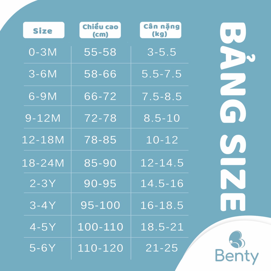 2. Hướng dẫn chọn size quần áo trẻ em BENTYSize 3M-6M (từ 3 đến 6 tháng): cân nặng 5,5-7,5kg, chiều cao 58 đến 66cmSize 6M-9M (từ 6 đến 9 tháng): cân nặng 7,5-8,5kg,chiều cao 66 đến 72cmSize 9M-12M (từ 9 đến 12 tháng) :cân nặng 8,5-10kg,chiều cao 72 đến78cmSize 12M-18M (từ 12 đến 18 tháng):cân nặng 10-12kg, chiều cao 78 đến 85cmSize 18M-24M (từ 18 đến 24 tháng): cân nặng 12-14,5kg, chiều cao 85 đến 90cmSize 2-3Y (từ 2 đến 3 tuổi): cân nặng 14,5 -16kg, chiều cao 90 đến 95cmSize 3-4Y (từ 3 đến 4 tuổi): cân nặng 16 -18.5kg, chiều cao 95 đến 105cmSize 4-5Y (từ 4 đến 5 tuổi): cân nặng 18,5 -21kg, chiều cao 105 đến 110cm