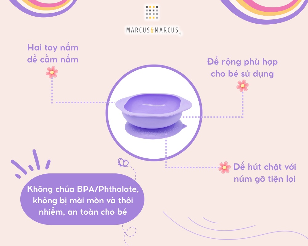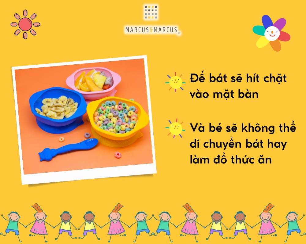 ? Đặc điểm bát ăn dặm silicon có đế hút chân không chống đổ Marcus & Marcus:● Đế rộng phù hợp cho bé sử dụng● Hai tay nắm dễ cầm nắm● Đế hút chặt với núm gỡ tiện lợi● Không chứa BPA/Phthalate, không bị mài mòn và thôi nhiễm, an toàn cho bé● Dễ dàng vệ sinh và tiệt trùng● Đáp ứng tiêu chuẩn EN14372