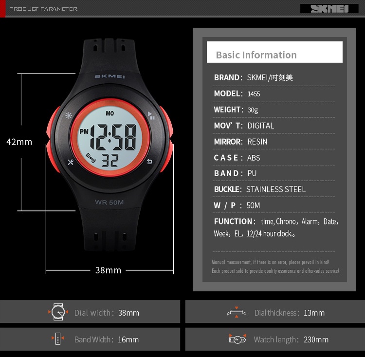 Độ dày vỏ: 13mmPhong cách: bảng điều khiển phun sơnTính năng: Lịch hoàn chỉnh, Chống va đập, Đồng hồ dừng, Ngày tự động, Hiển thị tuần, Chống nước, Đồng hồ bấm giờ, Đèn nền, Báo thức, Phát sáng, Bộ lặpChất liệu vỏ: NhựaHình dạng của hộp: TrònLoại đóng cửa: KhóaChiều dài dây: 23cmLoại vật liệu của dây đeo: PUChiều rộng dây đeo: 16mmChất liệu của hộp và trường hợp: Không có góiĐường kính quay số: 38mmLoại vật liệu cửa sổ quay số: NhựaĐộ sâu của chống nước: 5 BarThương hiệu: SkmeiKiểu máy: Kỹ thuật sốSố mô hình: SKMEI NEW 1455Tính năng-1: Đồng hồ trẻ emTính năng-2: 2 lầnTính năng-3: hệ thống 12/24 giờTính năng-4: Đồng hồ bấm giờTính năng-5: Chống thấm nước 50MFeature-6: Đồng hồ thể thaoTính năng-7: Chống sốcTính năng-8: Báo độngTính năng-9: Đèn nềnTính năng-10: SángGói hàng bao gồm: 1 * đồng hồ1 * hướng dẫn sử dụng.Không có hộp Dịch vụ:Chúng tôi là nhà sản xuất ban đầu từ Trung Quốc. Tất cả đều là Sản phẩm chất lượng 100%Chúng tôi cam kết cung cấp cho bạn sản phẩm với chất lượng cao nhất với giá cả hợp lý. Chắc chắn tận tâm để cung cấp trải nghiệm khách hàng tốt! Sự hài lòng của khách hàng là mục tiêu theo đuổi quan trọng đối với chúng tôi như mọi khi. Mọi người có thể yên tâm mua hàng của chúng tôi để nhận được sản phẩm chính hãng với dịch vụ chăm sóc khách hàng tuyệt vời của chúng tôi.• Đảm bảoHoàn tiền! Nếu mặt hàng bạn nhận được bị lỗi theo bất kỳ cách nào hoặc bạn mua nhầm hàng hoặc bất kỳ câu hỏi nào khác, vui lòng liên hệ với chúng tôi qua Shopee bằng ID đặt hàng của bạn.#Readystock #Skmei #Đồng hồ đeo tay #Khuyến mãi #Bigsale #Ngoài trời #Các môn thể thao #Xem #Con gái #Trẻ em #Bọn trẻ #1455