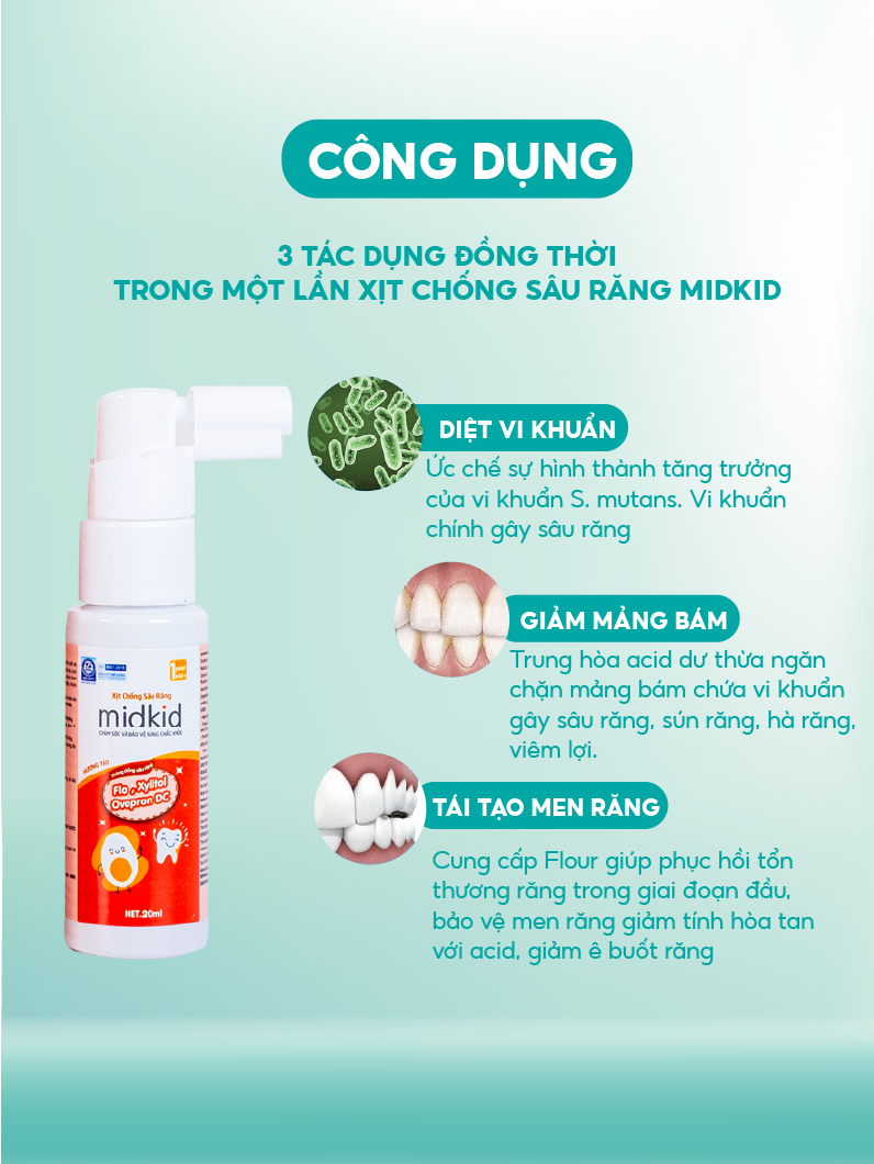 - Xịt trực tiếp Midkid vào chân răng và các bề mặt răng sẽ giúp làm sạch và bảo vệ men răng và khoang miệng