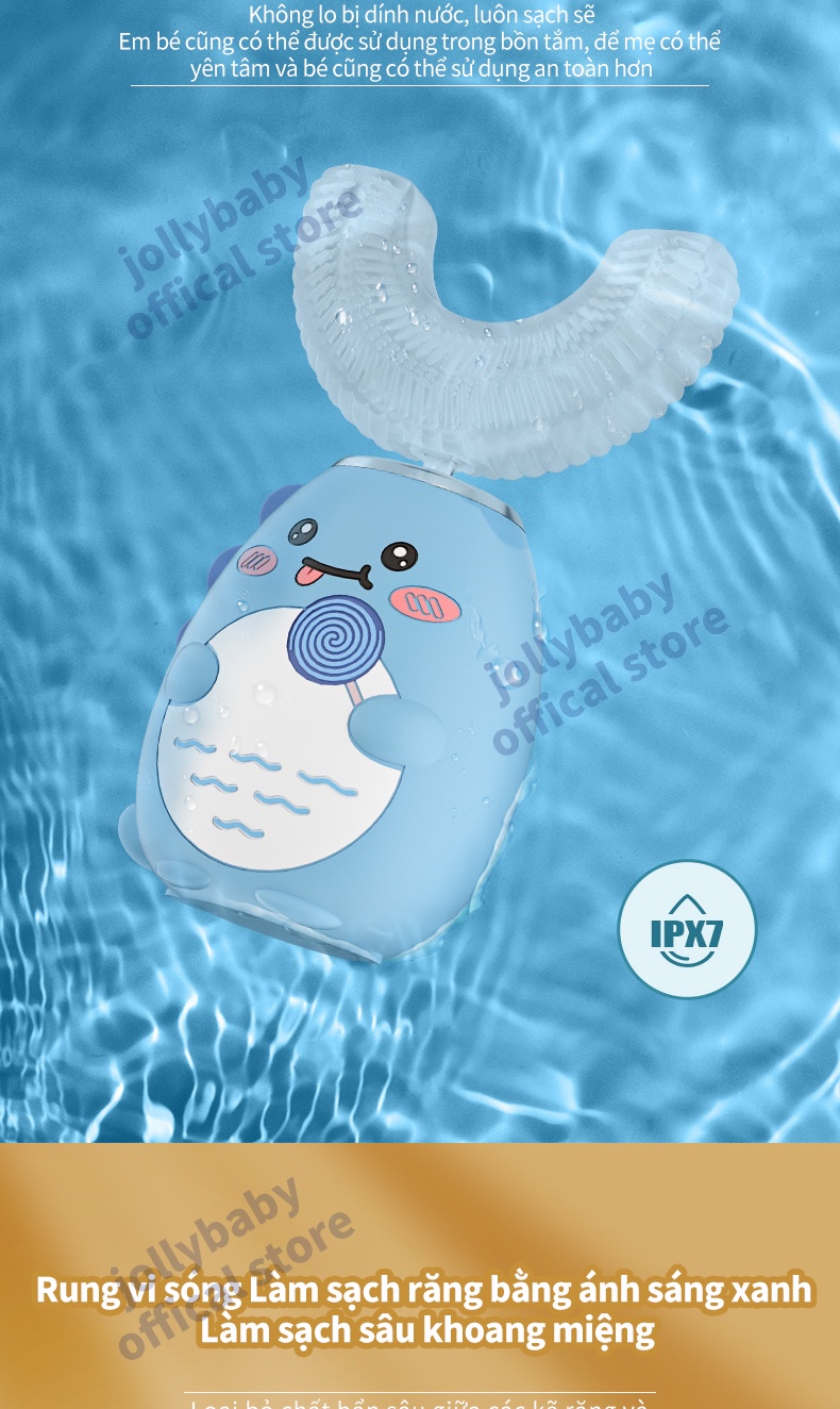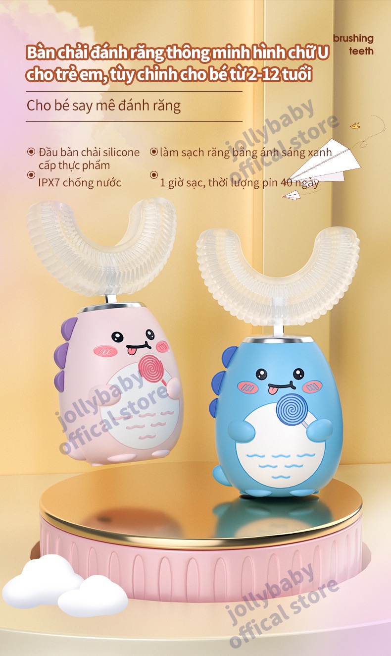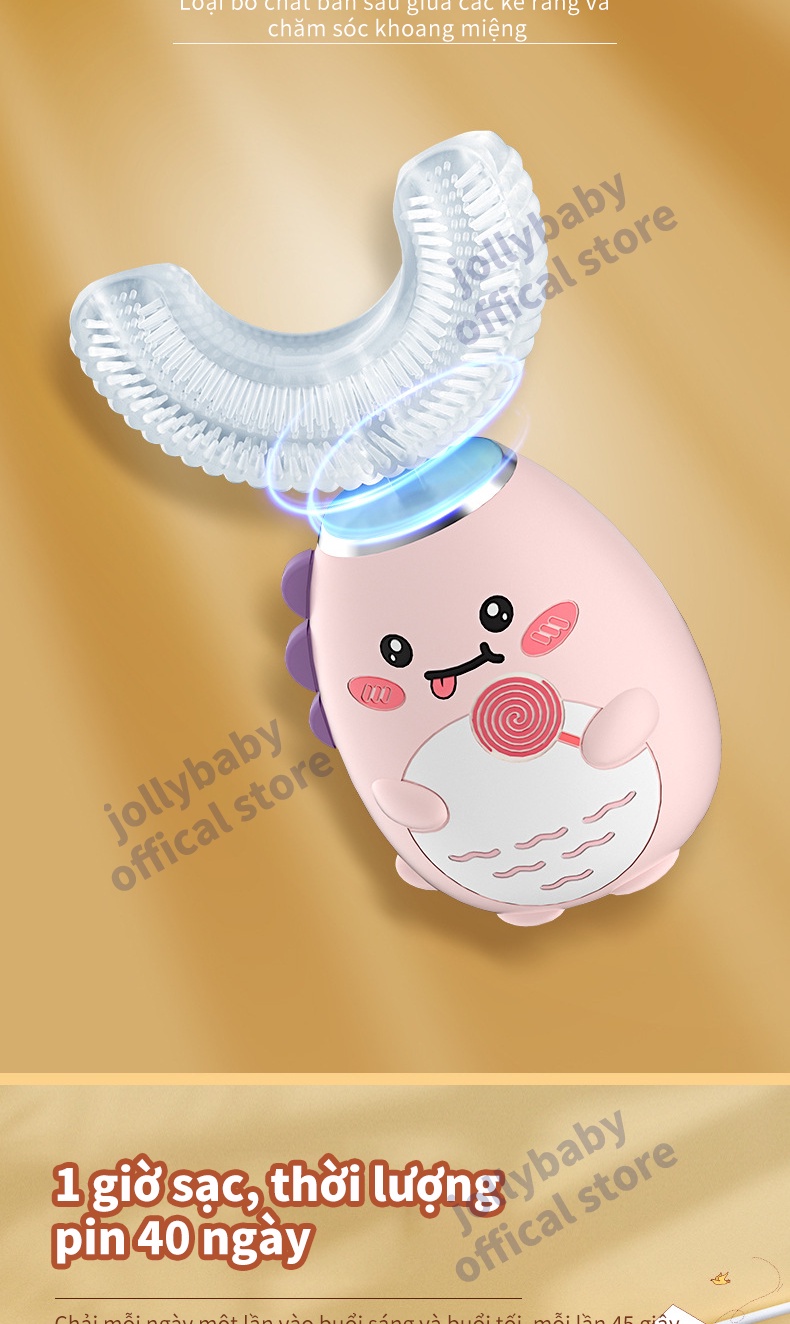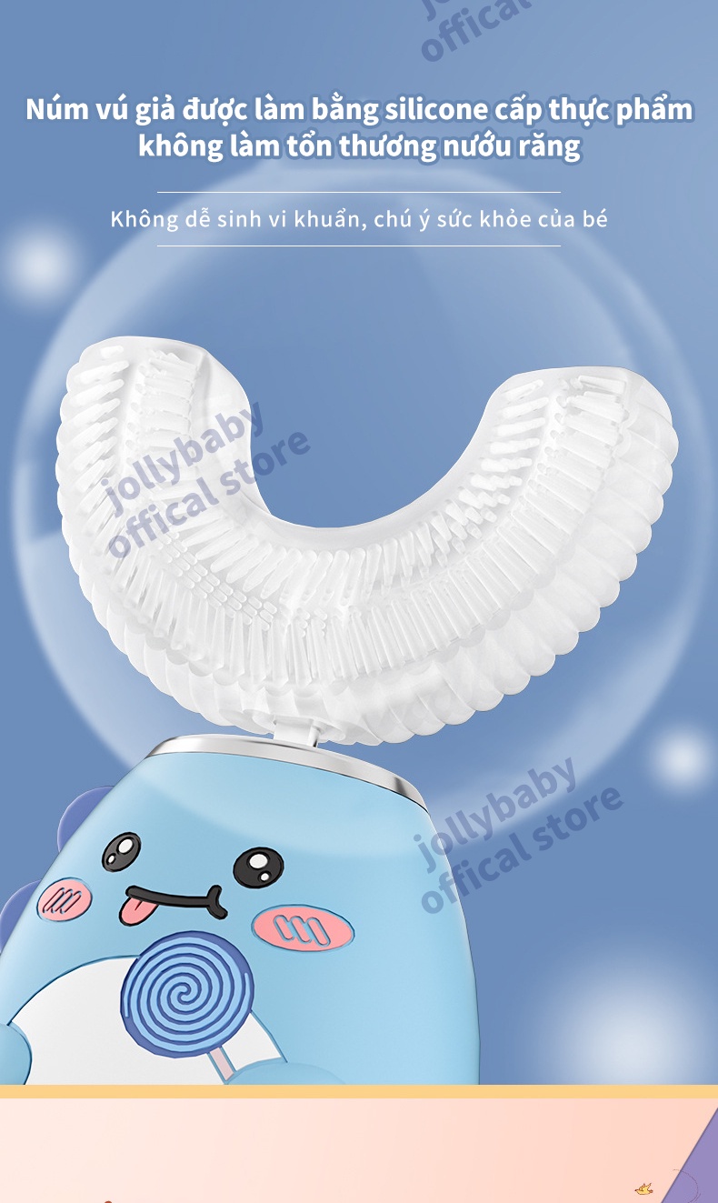 Jollybaby Bàn chải đánh răng điện hình chữ U của trẻ em siêu âm rung động hoàn toàn tự động không thấm nước và có thể sạc lại đầu bàn chải silicone phù hợp cho trẻ sơ sinh 3-12 tuổi