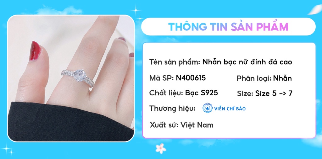 Nhẫn nữ đính đá cao chất liệu bạc 925 thời trang phụ kiện trang sức nữ Viễn Chí Bảo N400615