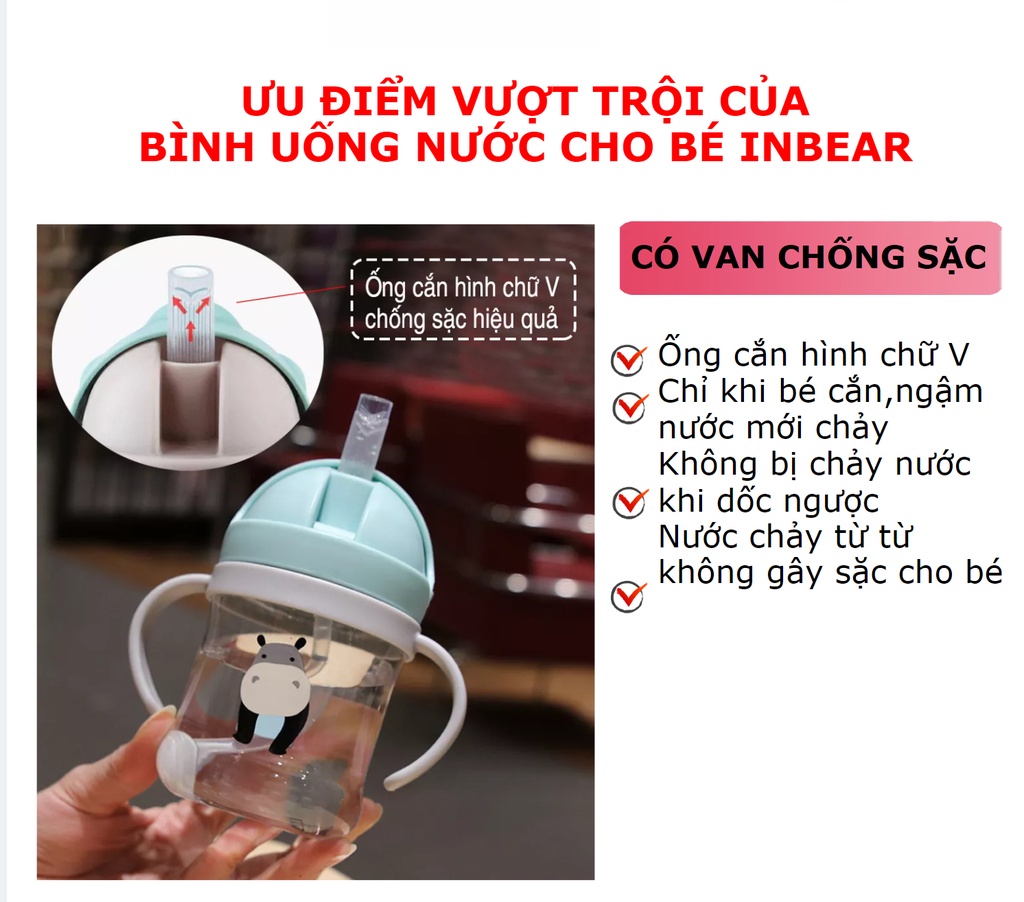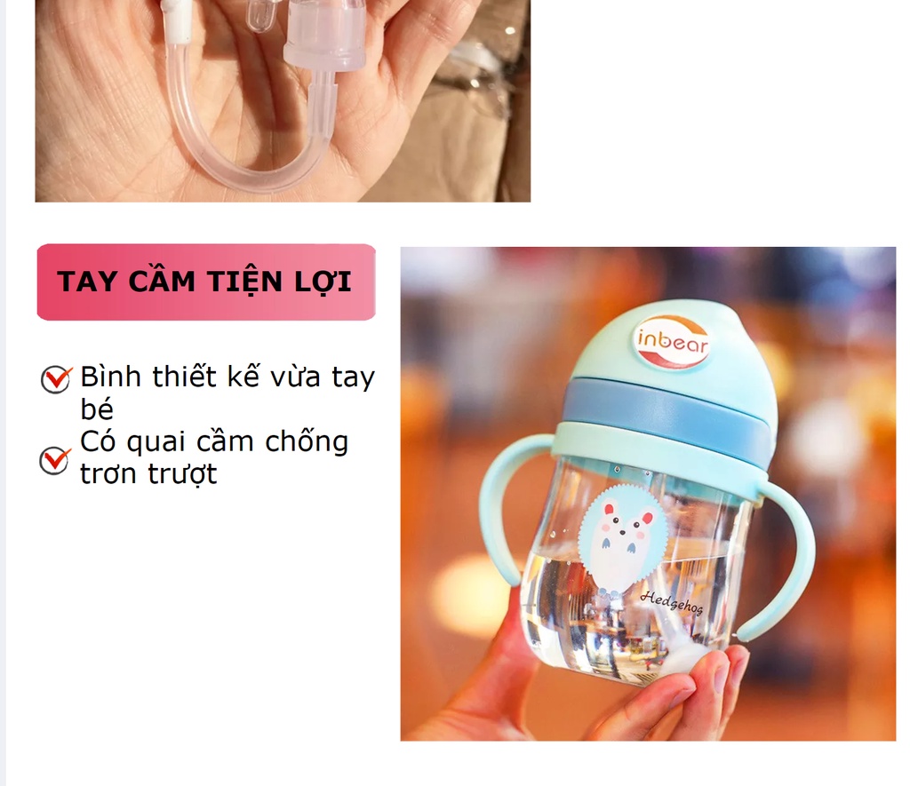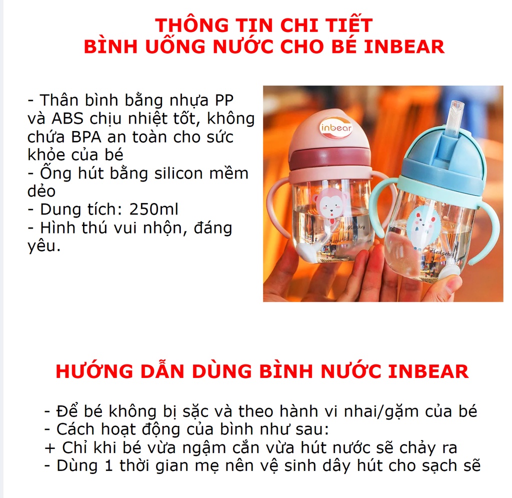 Bình Tập Uống Nước Cho Bé [Inbear] 250ml, Có Van Chống Sặc, Bình Tập Hút Có Tay Cầm, Có Ống HútĐỘ TUỔI PHÙ HỢP:Phù hợp với các bé từ 6 tháng trở lênCÁCH VỆ SINH:Có thể dùng máy tiệt trùng để vệ sinhKhông đun nấu bình ở nhiệt độ quá cao sẽ làm giảm tuổi thọ của bìnhCÔNG TY TNHH PHÂN PHỐI TOÀN CẦU MOLICA LÀ CÔNG TY NHẬP KHẨU VÀ PHÂN PHỐI CHÍNH HÃNG BÌNH NƯỚC INBEAR TẠI VIỆT NAMĐịa chỉ công ty: Số 32 Phố Chùa Thông, Phường Sơn Lộc, Thị Xã Sơn Tây, Hà Nội, Việt Nam