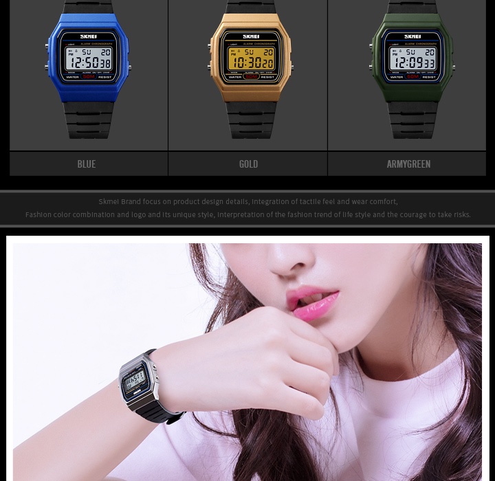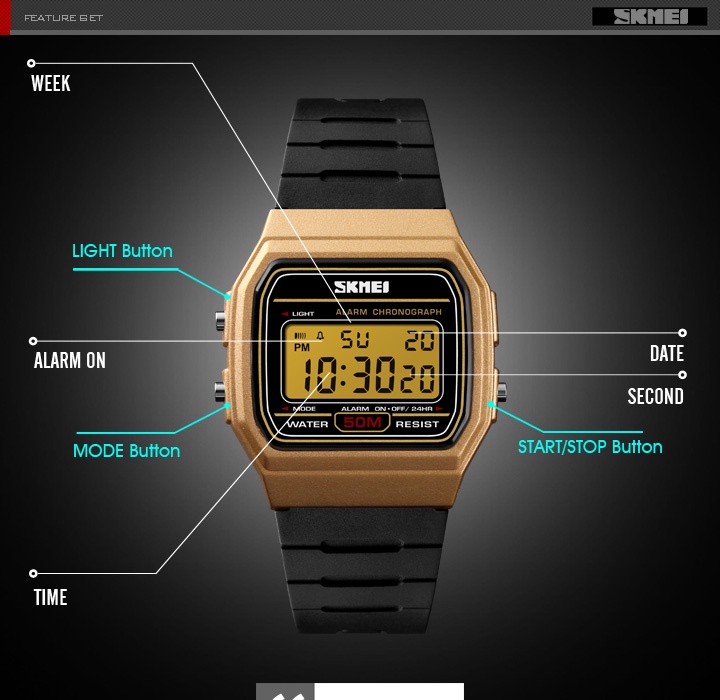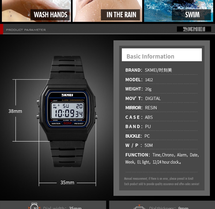 Thương hiệu: SKMEI 1412Dành cho: nam và nữPhong cách: Thời trang, đơn giảnKiểu máy: Kỹ thuật sốĐường kính quay số: 35mmChống nước 50mChức năng: Hiển thị thời gian, Hẹn giờ, Báo thức, Ngày, Tuần, Đèn El, Đồng hồ 12/24 giờDành cho: NamChất liệu vỏ: ABSChất liệu dây đeo: PULoại khóa: ChốtHình dạng quay số: Hình vuôngĐường kính quay số: 35mmĐộ dày vỏ: 9mmChiều rộng dây đeo: 16mmChiều dài dây đeo cổ tay: 23,5cmTrọng lượng: 40gChống nước 50mChức năng: Đồng hồ bấm giờ, Chống thấm nước 50M, Đồng hồ báo thức, 12/24, Đèn EL, Ngày, TuầnGói bao gồm: 1 x Đồng hồ đeo tay SKMEI (KHÔNG HỘP), 1 x Hướng dẫn sử dụng Bảo hành: Không.• Dịch vụ:1. Chúng tôi là nhà sản xuất chính hãng2. Tất cả các sản phẩm là chính hãng và mới 100%.3. Chúng tôi cam kết cung cấp cho bạn những sản phẩm chất lượng cao nhất với giá cả hợp lý.4. Đảm bảo mang đến cho khách hàng trải nghiệm tốt nhất!5. Sự hài lòng của khách hàng luôn là mục tiêu tồn tại của sự sống còn cho chúng tôi.6. Mọi người có thể yên tâm mua hàng của chúng tôi để nhận được sản phẩm chính hãng với dịch vụ chăm sóc khách hàng tận tình.