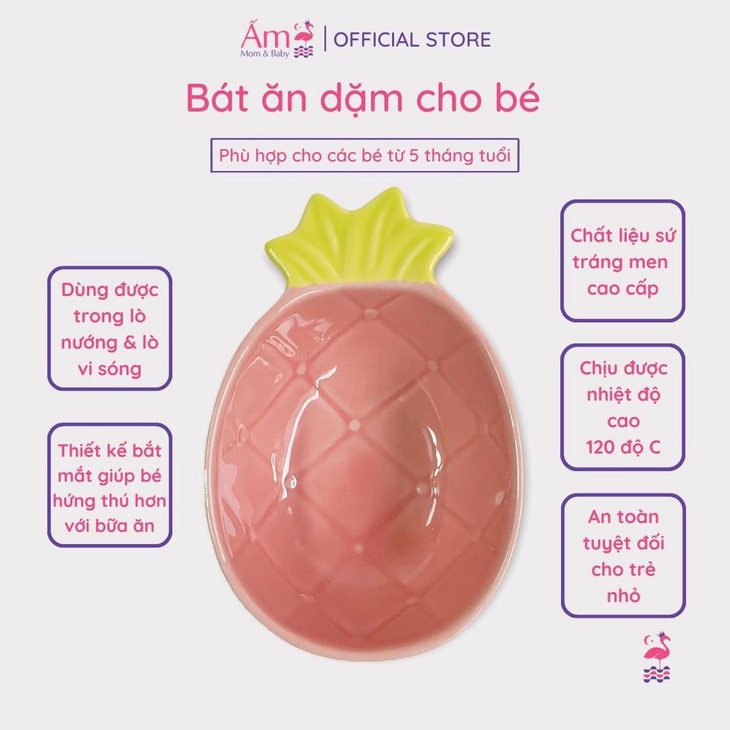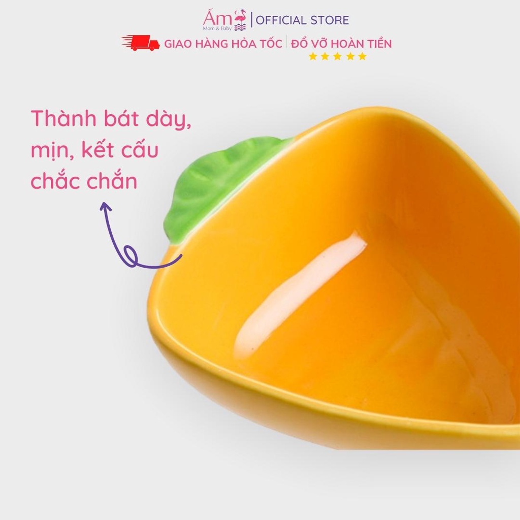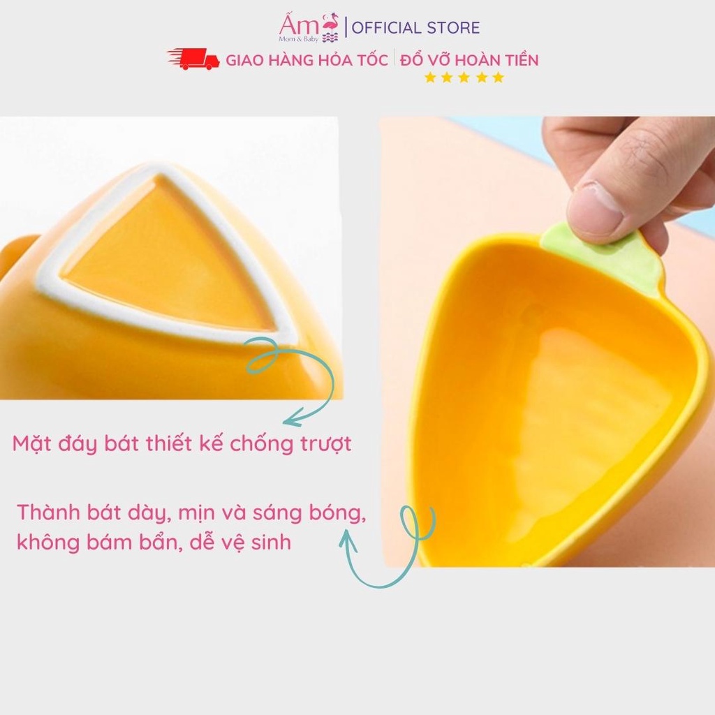 Bát Ăn Dặm Cho Bé Bằng Sứ Kiểu Nhật Bản Hoa Quả Chống Đổ - Chén Sứ Ăn Dặm Cho Bé - Ăn Dặm Không Phải Cuộc ChiếnCon yêu của bạn sắp sửa bước vào độ tuổi ăn dặm, bạn đang lo lắng không biết đây có phải là một “cuộc chiến” hay là một trải nghiệm ý nghĩa của hành trang làm mẹ? Từ việc lựa chọn phương pháp ăn dặm, những công thức ăn dặm của bé mà ngay cả lựa chọn dụng cụ ăn dặm cũng là những kiến thức mẹ cần tìm hiểu. Vậy bát ăn dặm nào tốt cho bé? Hiện nay có những loại bát cho bé ăn dặm nào? Hãy cùng tham khảo các mẫu bát ăn dặm bán chạy nhất cho bé cùng Ấm nhé.Bát tập ăn dặm cho bé đang là từ khóa được rất nhiều mẹ bỉm sữa tìm kiếm trên các trang mạng. Vậy nó như thế nào? Có gì đặc biệt? Đây là một dụng cụ đựng thức ăn được thiết kế riêng biệt dành cho lứa tuổi từ 6 tháng trở lên. Độ tuổi này được các chuyên gia khuyến cáo là phù hợp nhất để cho bé tập làm quen với thức ăn dặm.Khác với các loại dụng cụ đựng thức ăn khác, bát ăn dặm được thiết đặc biệt hơn: chất liệu đảm bảo an toàn cho bé, các tính năng tiện ích như chống nóng, chống đổ, trơn trượt, có khả năng chịu được lực va đập mạnh và cấu trúc hình thức rất phong phú.Ngày nay việc tập cho bé ăn dặm kiểu Nhật không còn xa lạ với các mẹ, với nhiều loại thức ăn và các hình thù sinh động bắt mắt. Phương pháp ăn dặm kiểu Nhật là sự phối hợp các loại thực phẩm khác nhau để tạo nên thực đơn ăn dặm đa dạng, ngon miệng và phù hợp với từng giai đoạn phát triển của trẻ. Nhờ đó, kích thích trẻ ăn ngon, tiêu hóa tốt và hấp thu đầy đủ các chất dinh dưỡng. Các bé sẽ cảm thấy thích thú và muốn khám phá bữa ăn hơn.Phương pháp ăn dặm kiểu Nhật.Đây là phương pháp ăn dặm đang được đông đảo các mẹ bỉm sữa tìm hiểu và áp dụng cho con yêu của mình.Với phương pháp ăn dặm kiểu Nhật, các loại bát được thiết kế dựa vào sự phối hợp của nhiều thực phẩm để tạo ra một bữa ăn đa dạng, nhiều màu sắc nhằm thích kích vị giác và thị giác của bé, từ đó giúp bé ăn ngoan hơn.Những bộ bát ăn dặm của Nhật thường được thiết kế nhiều ngăn, nhiều màu sắc với những hình dáng ngộ nghĩnh và đáng yêu từ các nhân vật hoạt hình.Bát ăn dặm bằng sứ.Loại bát cho bé tập ăn dặm được làm bằng chất liệu sứ này đang là sản phẩm ưu việt và được lựa chọn nhiều nhất. Đây là sản phẩm đảm bảo được an toàn vệ sinh và có tính thẩm mỹ cao, dễ tìm mua, nhiều lựa chọn.Ấm Baby sẽ chia sẻ cho các Mom những mẫu bát ăn dặm cho bé cực kì bắt mắt nhé: ?Bát ăn dặm kiểu Nhật được làm từ chất liệu gốm sứ cao cấp nên an toàn cho sức khỏe của bé. Dung tích từ 120-150ml rất phù hợp cho bé ăn dặm?Bát ăn dặm gốm sứ chịu được nhiệt độ cao, dùng được trong lò nướng, lò vi sóng và cả máy rửa bátMỗi món ăn mẹ có thể bày biện và trang trí vào những bát sứ ăn dặm cho béHãy cùng Ấm Mom & Baby tạo ra những bữa ăn hấp dẫn bằng những chén sứ ăn dặm cho bé nhéSản phẩm bát ăn dặm về nhiều và liên tục cập nhật mẫu mã. Cần tư vấn gì các bạn cứ liên hệ Ấm để được giải đáp thắc mắc nhé.Chính sách đổi trả: Trong trường hợp bạn cho rằng mặt hàng đã được gửi đi có bất kỳ lỗi nào thuộc về Shop, hoặc nếu bị hư hại trong quá trình vận chuyển, chúng tôi rất sẵn lòng được hỗ trợ. Vui lòng thông báo cho Ấm Gift & Decor về hàng lỗi trong vòng 24 giờ kể từ lúc nhận hàng. Đừng ngần ngại liên hệ với chúng tôi hoặc Chat trực tiếp trên Shopee để được hỗ trợ tốt nhất.