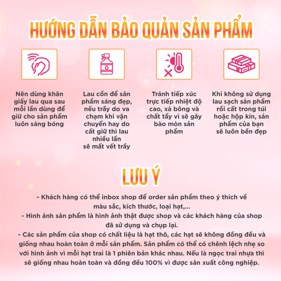 -----?HƯỚNG DẪN BẢO QUẢN SẢN PHẨM Bộ Trang Sức Ngọc Trai Phụ Kiện Bạc Mạ Vàng Độ Sáng 5A Hạt Tròn Đều - Ngọc Trai Trường Thịnh- Nên dùng khăn giấy lau qua sau mỗi lần dùng để giữ cho sản phẩm luôn sáng bóng- Lau cồn để sản phẩm sáng đẹp, nếu trầy do va chạm khi vận chuyển hay do cất giữ thì lau nhiều lần sẽ mất vết trầy- Tránh tiếp xúc trực tiếp nhiệt độ cao, xà bông và chất tẩy vì sẽ gây bào mòn sản phẩm- Khi không sử dụng lau sạch sản phẩm rồi cất trong túi hoặc hộp kín, sản phẩm của bạn sẽ luôn bền đẹp? Nếu có thắc mắc hay vấn đề về sản phẩm xin bạn đừng vội đánh giá không tốt cho shop hãy inbox ngay để shop hỗ trợ, giúp đỡ quý khách nhanh chóng và hiệu quả nhất nhé ạ? Những đánh giá tích cực của quý khách là động lực để Trường Thịnh hoàn thiện sản phẩm và chất lượng phục vụ tốt hơn. Nhận được sản phẩm tốt xin cho 5 sao ủng hộ shop nhé ạ!-----?CHÍNH SÁCH BẢO HÀNH VÀ ĐỔI TRẢ CỦA NT TRƯỜNG THỊNH- Sản phẩm Quý khách nhận sau khi mua sắm nếu có bất cứ vấn đề gì cần giải đáp, hỗ trợ hãy chat ngay cho shop để được nhân viên chăm sóc nhanh nhất- Hỗ trợ đổi trả miễn phí trong vòng 07 ngày (theo chính sách của Shopee)* Điều kiện áp dụng chính sách:+ Trang sức vẫn còn mới, chưa qua sử dụng, không sứt mẻ hoặc có tác động vật lý gây biến dạng+ Trang sức bị lỗi hoặc hư hỏng do nhà sản xuất hoặc do vận chuyển (quý khách nhớ cung cấp bằng chứng mở hàng)* Các trường hợp phù hợp chính sách:+ Không đủ số lượng trang sức như trong đơn hàng (bao gồm cả quà tặng kèm)+ Trang sức bạc không đúng size, kiểu dáng như quý khách đặt hàng+ Thời gian đổi trả vẫn còn trong 7 ngày theo quy định* Trường hợp không phù hợp kiện áp dụng chính sách:+ Quá 07 ngày kể từ khi quý khách nhận trang sức bạc+ Hàng được hoàn trả không đúng mẫu, không phải trang sức của shop+ Lý do không hợp lý: không thích, không hợp, đặt nhầm, nhầm màu trang sứcDo màn hình các thiết bị khác nhau và điều kiện ánh sáng khác nhau, màu sắc thực tế của trang sức có thể chênh lệch đôi chút trong phạm vi chấp nhận được*Lưu ý: Khi nhận và mở hàng anh/chị vui lòng quay video làm bằng chứng để quy trình đổi trả được thuận tiên và có bằng chứng rõ ràng nhé ạ! Và hàng gửi đổi trả phải bao gồm quà tặng kèm thì shop mới có thể giải quyết cho khách nhé ạ!-----?Sản phẩm của: CÔNG TY TNHH TSNT TRƯỜNG THỊNH46D Trần Đình Xu phường Cô Giang quận 1 TP HCM