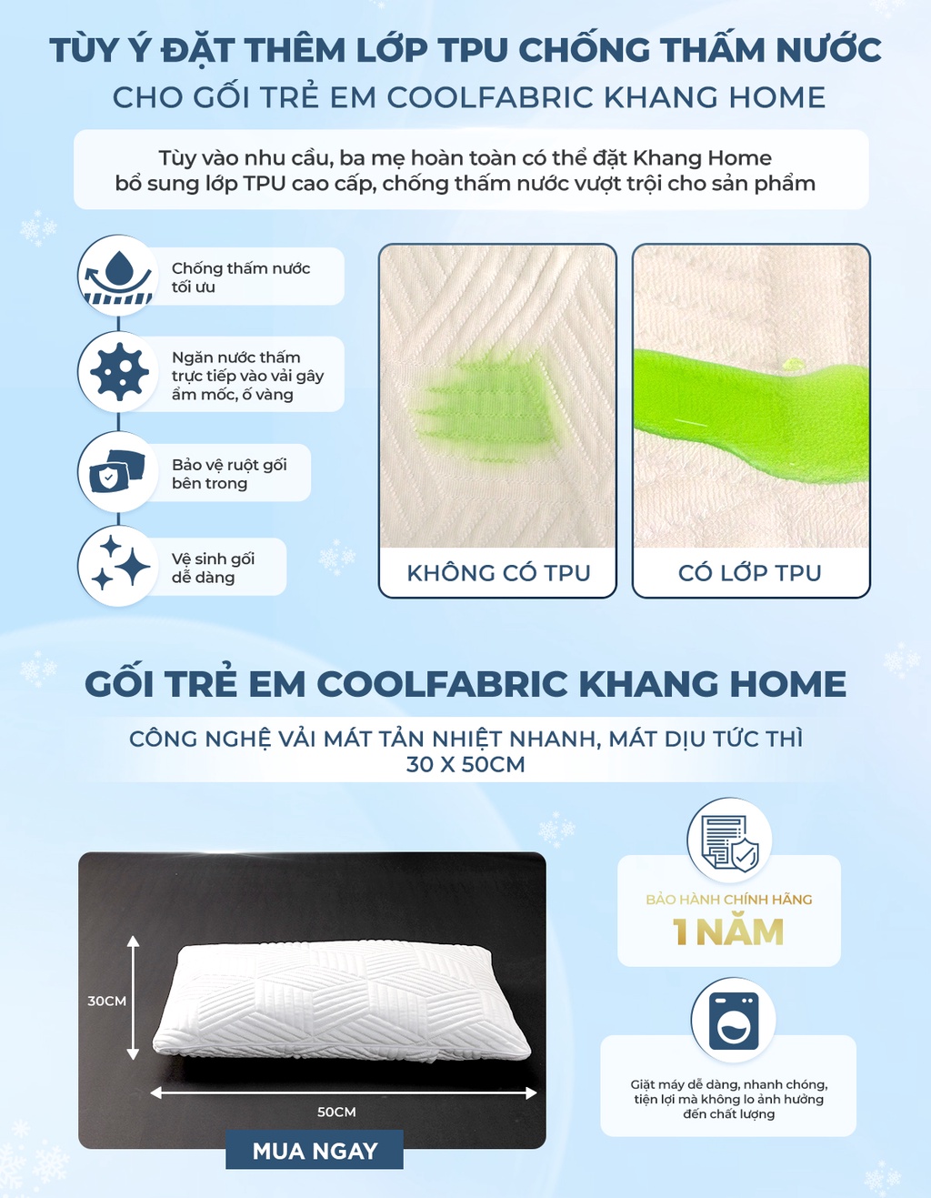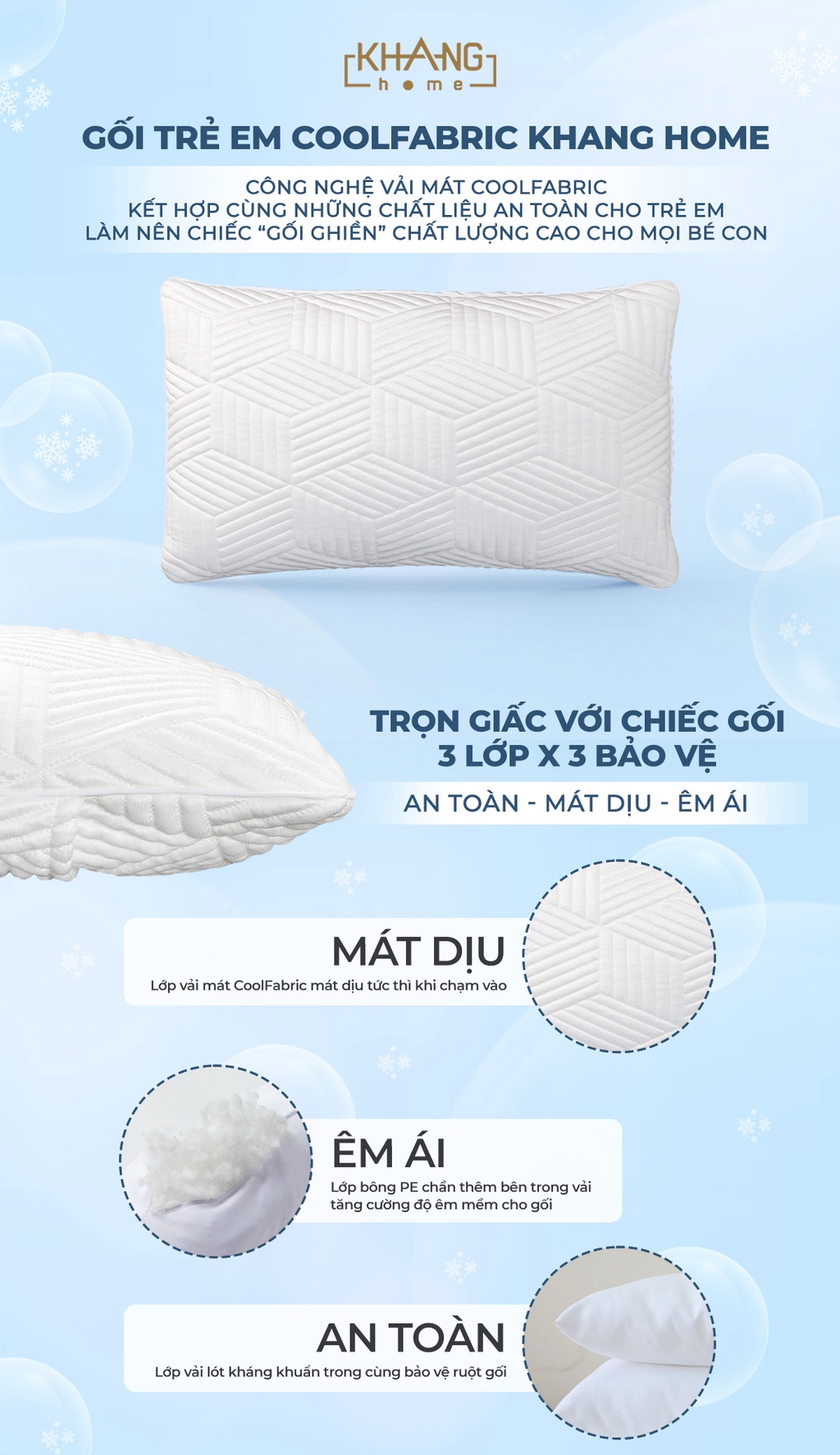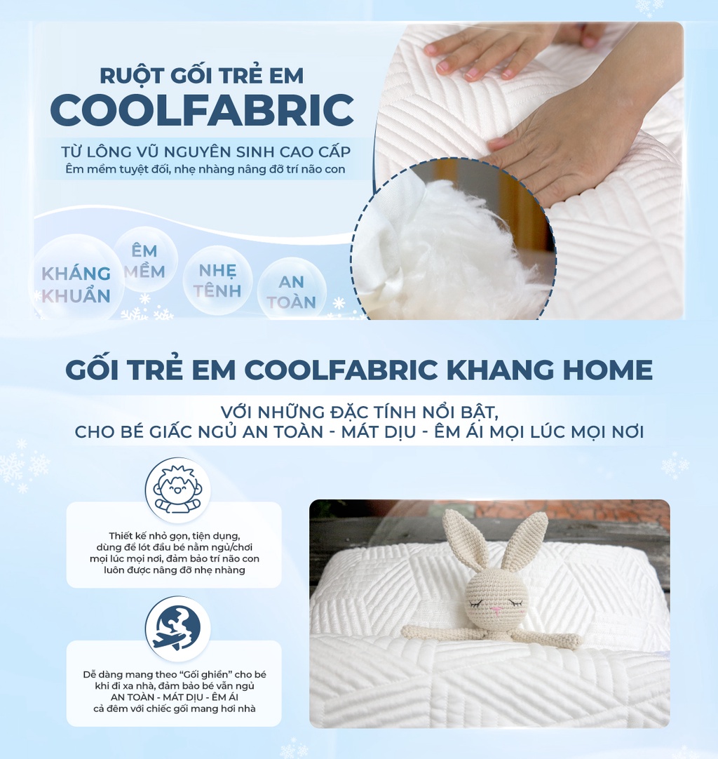 Gối Trẻ Em CoolFabric Khang Home-Công Nghệ Vải Mát Tản Nhiệt Nhanh, Mát Dịu Tức Thì có kích thước 30x50cm, phù hợp cho trẻ em từ 2-7 tuổi.1. Gối Trẻ Em CoolFabric Khang Home - Sự kết hợp hài hòa giữa các chất liệu cao cấp, tốt nhất hiện nay làm nên chiếc "Gối ghiền" chất lượng cao cho bé con.Vải gối gồm 3 lớp đan xen tinh tế:(1) Lớp vải mát ứng dụng Công Nghệ Vải Mát CoolFabric - Chất liệu vải Polyethylene 450g với đặc tính tản nhiệt nhanh chóng nhờ vào các rãnh thoát nhiệt trên bề mặt. Công nghệ dệt hiện đại tạo lớp vải với mật độ cao giúp hấp thụ nhanh các phân tử nước, làm vải có chức năng phân tán nhiệt cơ thể nhanh chóng, đẩy nhanh quá trình thoát mồ hôi và giảm nhiệt độ cơ thể tạo cảm giác mát dịu tức thì trên da bé. Vải mát CoolFabric không chứa hóa chất, đã thông qua kiểm định về tiêu chuẩn các chất gây ung thư và formadehit trên vải, đảm bảo an toàn cho làn da và sức khỏe bé.(2) Lớp bông PE được chần thêm bên trong nhằm tăng cường độ êm ái cho gối.(3) Lớp vải lót kháng khuẩn bảo vệ ruột gối, đảm bảo môi trường bên trong gối an toàn cho sức khỏe bé.Ruột gối từ lông vũ cao cấp, kháng khuẩn. êm mềm và nhẹ tênh cho bé giấc ngủ thư thái, thoáng mát và an toàn cho làn da trẻ nhỏ.3. Tận hưởng ưu đãi cùng chế độ bảo hành hấp dẫn khi mua Gối Trẻ Em CoolFabric Khang Home-Công Nghệ Vải Mát Tản Nhiệt Nhanh, Mát Dịu Tức Thì 30x50cmSản phẩm Gối Trẻ Em CoolFabric Khang Home-Công Nghệ Vải Mát Tản Nhiệt Nhanh, Mát Dịu Tức Thì kèm mức bảo hành chính hãng lên đến 01 năm. Gối Trẻ Em CoolFabric Khang Home giặt máy dễ dàng, nhanh chóng, tiện lợi mà không lo ảnh hưởng đến chất lượng.Ba mẹ tùy ý đặt thêm lớp TPU chống thấm nước cho sản phẩm tùy vào nhu cầu của bé con. Lớp TPU chống thấm nước tối ưu, ngăn ngừa nước thấm trực tiếp vào vải gây ẩm mốc, ố vàng, ảnh hưởng đến môi trường của ruột gối bên trong.Truy cập Khang Home để đặt mua ngay Gối Trẻ Em CoolFabric Khang Home-Công Nghệ Vải Mát Tản Nhiệt Nhanh, Mát Dịu Tức Thì. Ngoài ra còn có cơ hội trở thành khách hàng thân thiết, tận hưởng hàng loạt ưu đãi hấp dẫn có một không hai từ Khang Home.*** KHANGHOME CAM KẾT - ĐẢM BẢO VỚI TIÊU CHÍ ***"CHẤT LƯỢNG CAO VÌ SỰ AN TOÀN CHO BÉ"#goitreem #goi #mat #CoolFabric