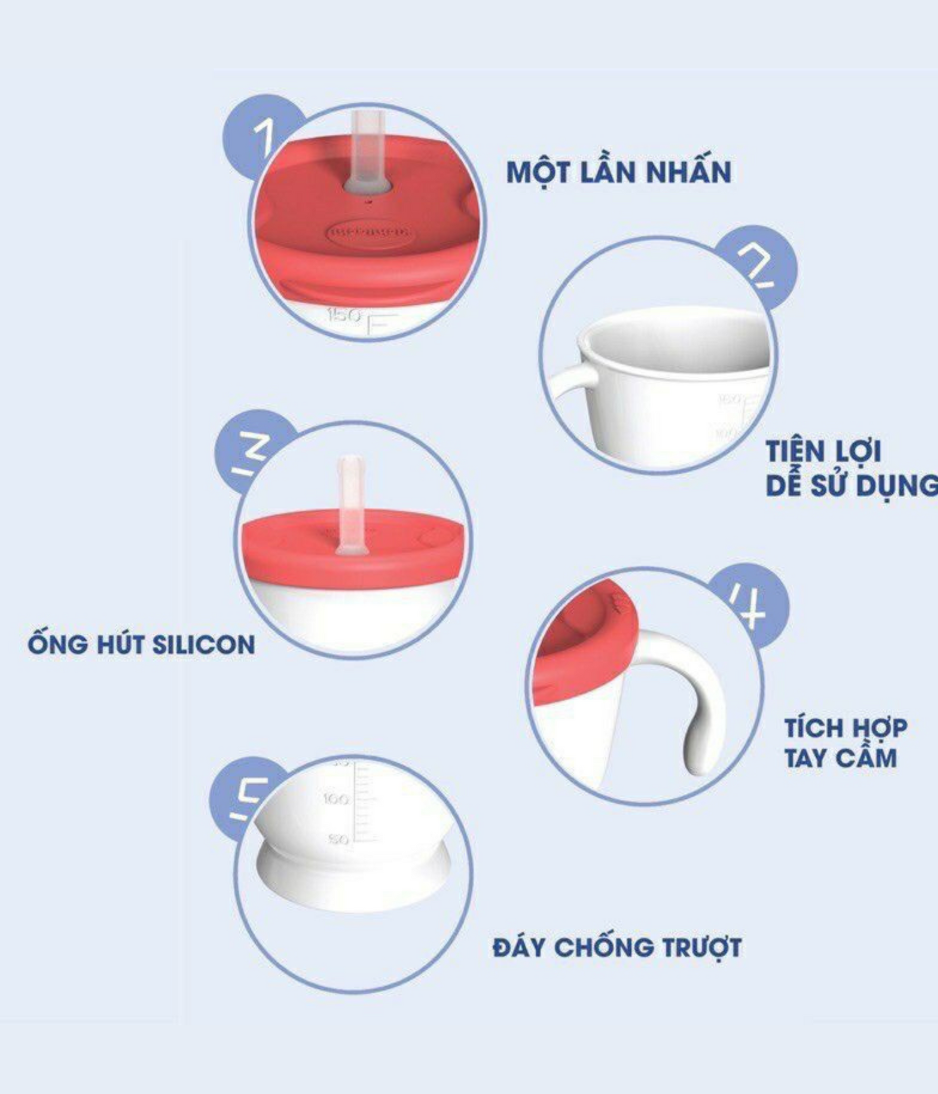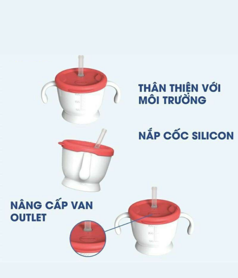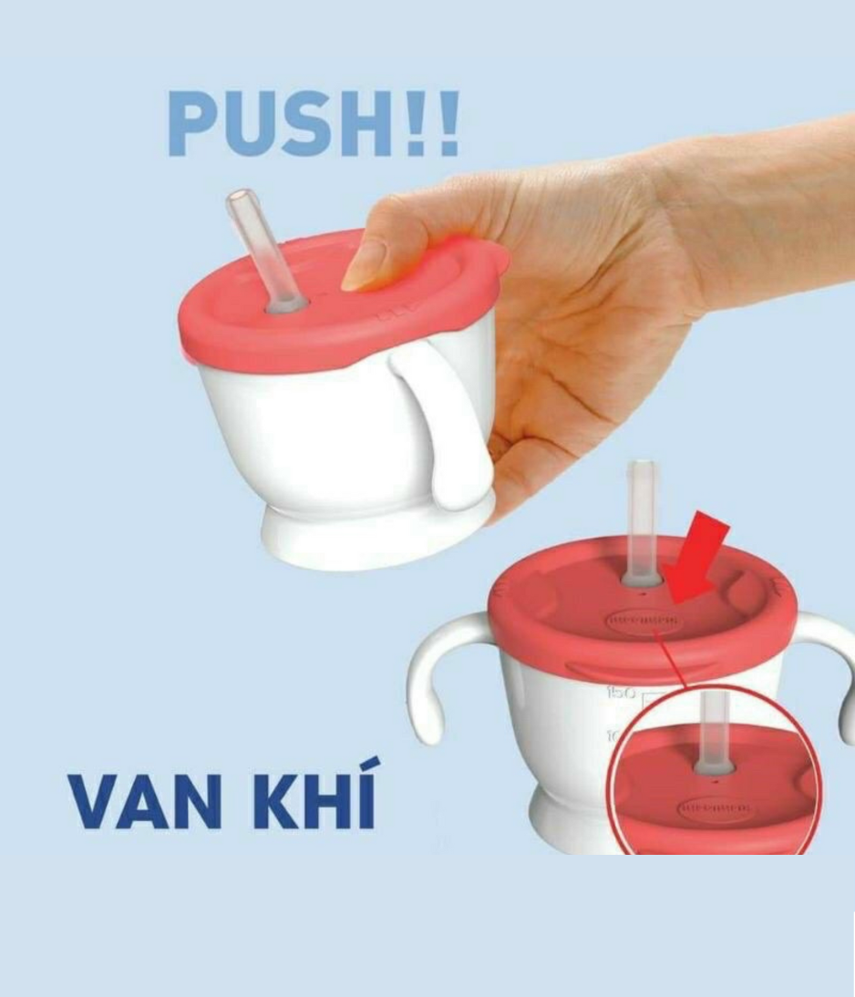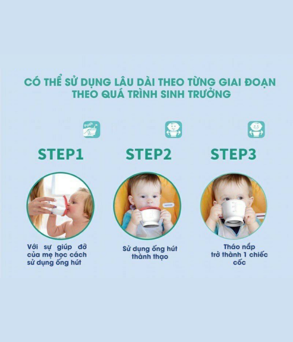 - Giai đoạn 2 (bé từ 6-9 tháng, bé dùng cốc ống hút): Thiết kế tay cầm 2 bên mảnh và uốn rộng, bé dễ dàng tự cầm để hút nước. Bé dùng cốc ống hút. Ống hút bằng silicon, chu vi hình elip vừa với khuôn miệng của bé, giúp bé uống dễ dàng và gọn gàng.