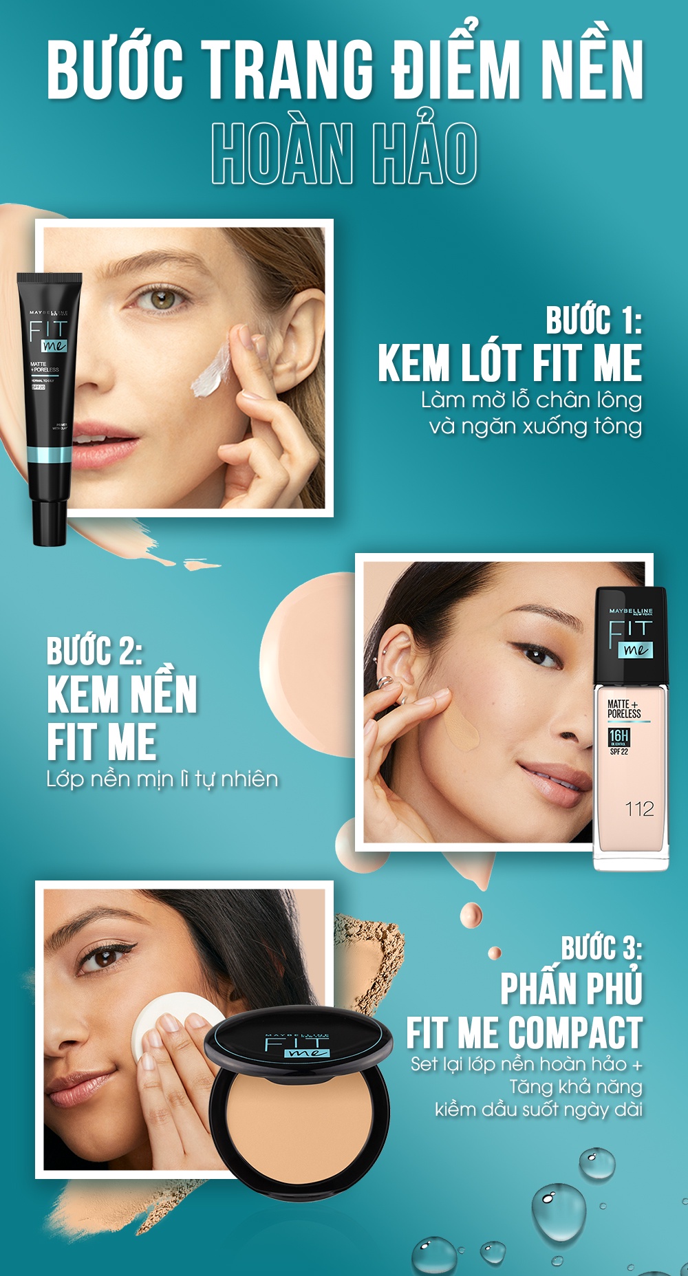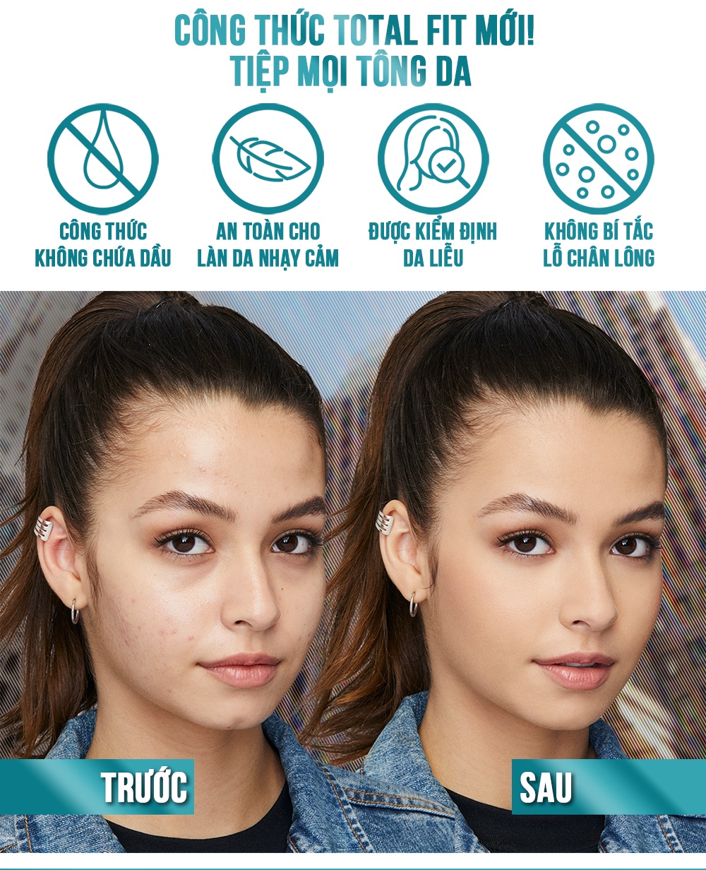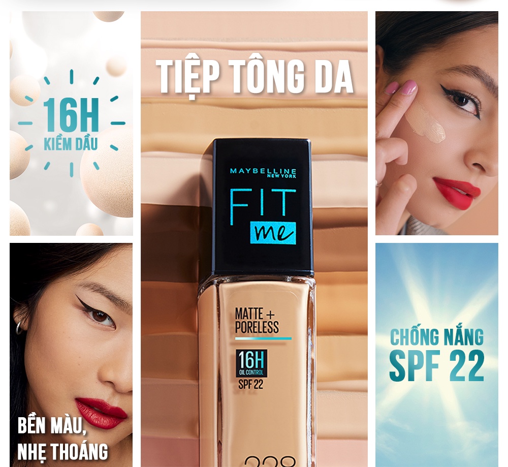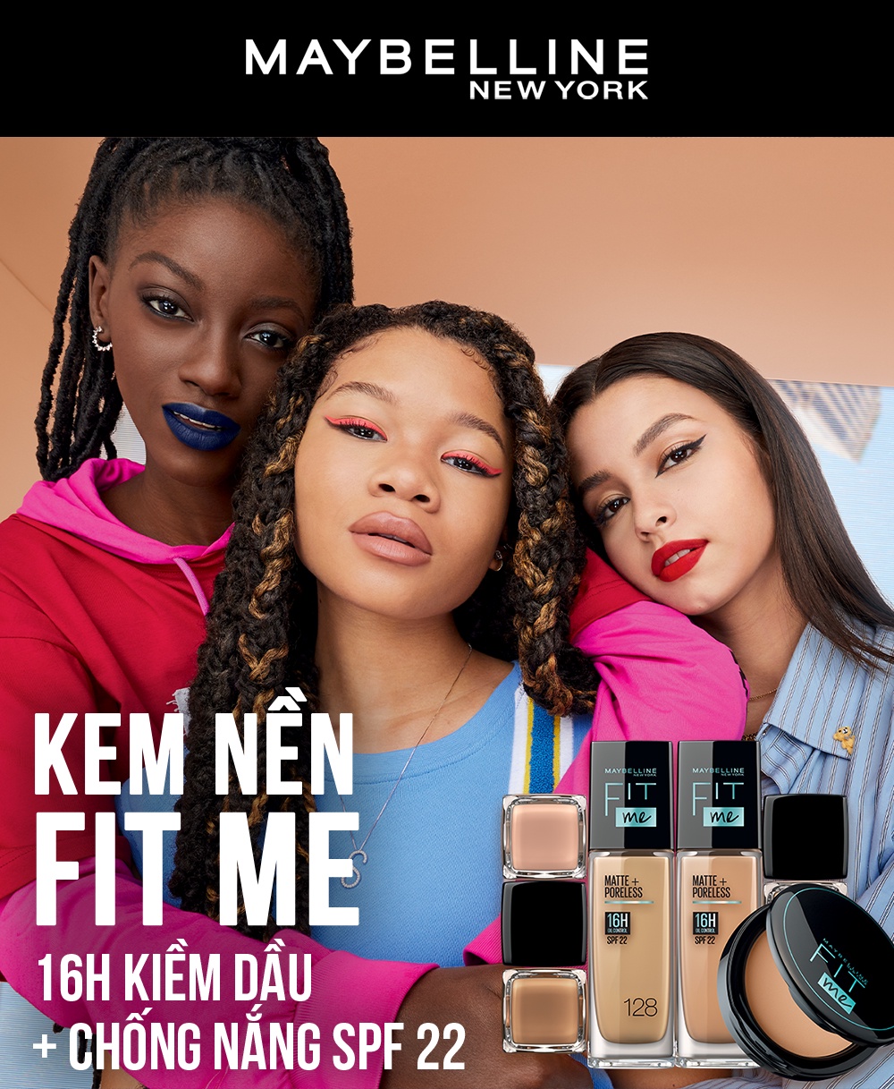 • VÌ SAO BẠN SẼ THÍCH?Kem Nền Mịn Nhẹ, Kiềm Dầu Maybelline Fit Me 30ml Fit Me gây tiếng vang trong giới làm đẹp toàn thế giới và được mệnh danh là kem nền 'quốc dân' khi có mặt tại Việt Nam. Kem nền Fit Me gây ấn tượng với khả năng kiềm dầu cho lớp nền mịn lì tự nhiên, đồng thời che phủ tốt mọi khuyết điểm trên bề mặt da và che phủ hoàn hảo lỗ chân lông. Dòng kem nền Fit Me có 12 tông màu phù hợp, tiệp mọi tông da phụ nữ Việt Nam. Kem nền lý tưởng dành cho da thường, da hỗn hợp thiên dầu & da dầu.BẢNG MÀU:Tông trắng103, 108,110, 109Tông sáng: 112 NATURAL IVORY115 IVORY120 CLASSIC IVORYTông trung bình:118 Light Beige SPF125 NUDE BEIGE128 WARM NUDE130 BUFF BEIGE220 NATURAL BEIGE222 TRUE BEIGETông ngăm: 230 NATURAL BUFF235 PURE BEIGE310 SUN BEIGE• ƯU ĐIỂM NỔI BẬT- Kềm dầu tốt, cho lớp nền luôn mịn lì. - Độ che phủ trung bình- cao, che khuyết điểm & lỗ chân lông hoàn hảo. - Hiệu ứng mịn nhẹ tự nhiên - 12 tông màu tiệp mọi tông da. - Kem nền lý tưởng cho da thường, da hỗn hợp và da dầu. - Bao bì cải tiến với đầu nhấn tiện lợi.• HIỆU QUẢ SỬ DỤNGKem nền Fit Me được đánh giá cao bởi người tiêu dùng với khả năng kiềm dầu tốt, lên da mịn nhẹ tự nhiên nhưng vẫn che phủ tốt khuyết điểm và lỗ chân lông.• HƯỚNG DẪN SỬ DỤNG- Chấm đều kem nền 5 điểm lên mặt (vùng trán, mũi, cằm và 2 má). - Tán đều kem theo hướng từ trong ra ngoài. - Sử dụng các bước sau để đảm bảo một lớp nền hoàn hảo lâu trôi không tì vết:1. Dùng Kem lót Baby Skin giúp làm mịn và mờ khuyết điểm, giúp giữ lớp trang điểm lâu hơn và mền mịn hơn trước.2. Sau bước kem nền, sử dụng kem che khuyết điểm Fit Me để che các khuyết điểm trên da và sử dụng tiếp phấn phủ Fit Me Matte Powder để khóa lớp trang điểm trên da.3. Cuối cùng sử dụng phấn má hồng Fit Me để tô điểm cho gương mặt ửng hồng tự nhiên