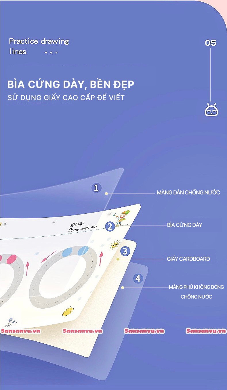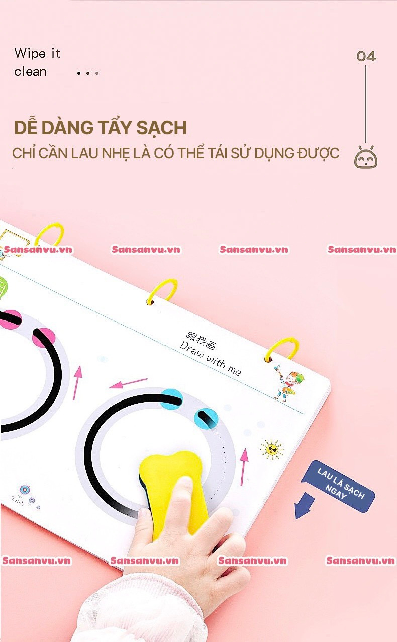 Sản phẩm được thiết kế đặc biệt với lượng mực chấm chỉ đủ để trẻ có thể viết và vẽ nhiều lần, nhưng lại không bị dơ hoặc bị hư hỏng bởi việc dùng tay lau. Với khả năng xóa dễ dàng, tập tô vẽ viết xóa cũng có thể được sử dụng lâu dài mà không cần phải lo lắng về sự phai màu hay bị rách.