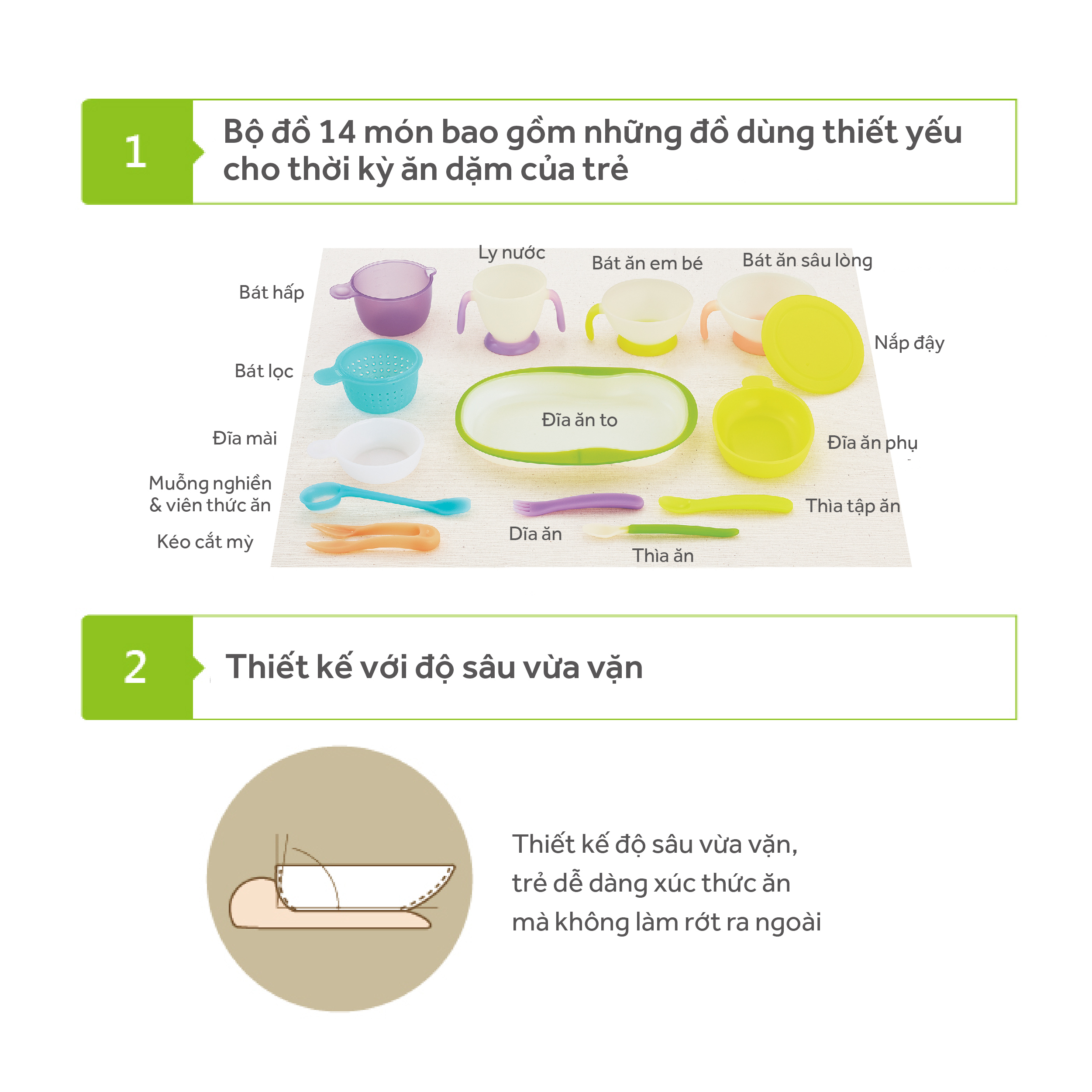 Bộ đồ ăn tổng hợp 14 món Combi là sự lựa chọn hoàn hảo khi bắt đầu hành trình ăn dặm cho trẻ. Bộ đồ bao gồm các đồ dùng chế biến giúp mẹ dễ dàng chuẩn bị đa dạng các món ăn dặm và các đồ dùng ăn dặm với thiết kế kiểu dáng thông minh, màu sắc vui nhộn giúp bé thích thú vào hào hứng hơn trong mỗi bữa ăn. ------------ Chất liệu: Nhựa an toàn, Free BPA Hãng sản xuất: Combi Corporation Japan