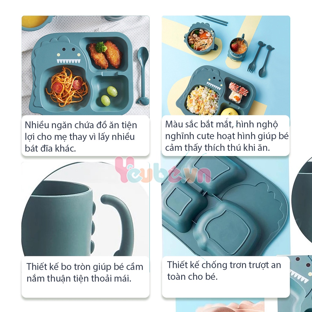 Set khay ăn dặm lúa mạch cao cấp YEUBEVN hình khủng long 6 món kèm cốc bát thìa nĩa đũa siêu đáng yêu cho bé