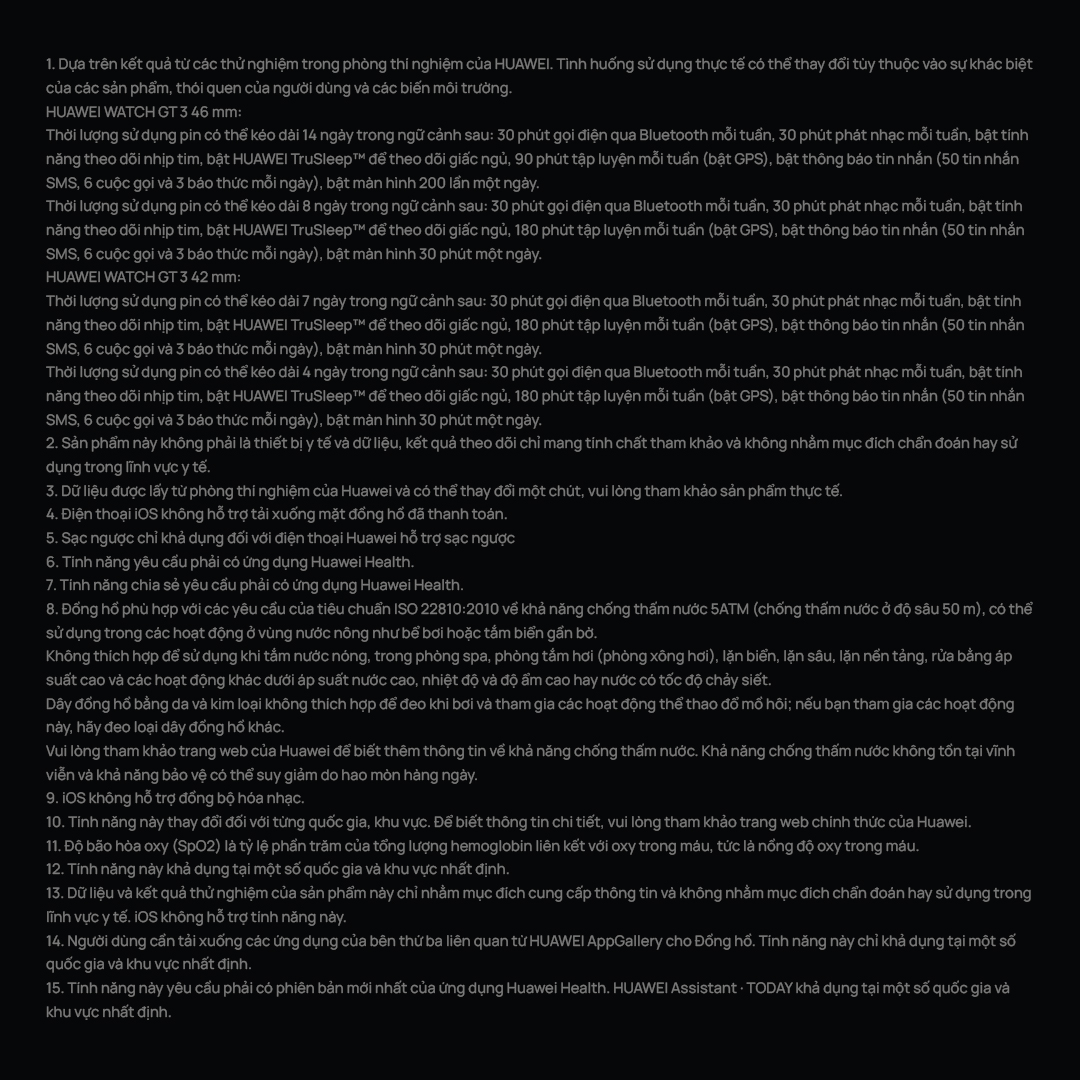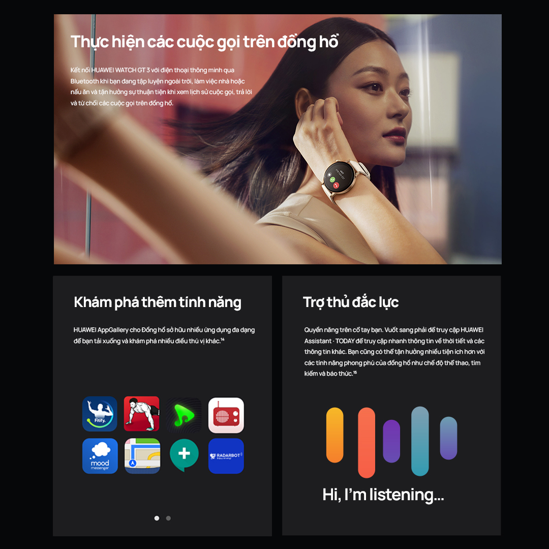 Trả góp 0%: https://shopee.vn/m/tra-gop-0-lai-suat Mô tả tìm kiếm:Xem toàn bộ thông số kỹ thuật của HUAWEI WATCH GT 3, chiếc đồng hồ Huawei thông minh mới với thiết kế cổ điển, thời lượng sử dụng pin dài, khả năng theo dõi nhịp tim và SpO2 chính xác hơn cùng các chế độ tập luyện chuyên nghiệp và kế hoạch được cá nhân hóa. Từ khóa tìm kiếm:thông số kỹ thuật HUAWEI WATCH GT 3, thông số kỹ thuật WATCH GT 3, thông số kỹ thuật của đồng hồ Huawei thông minh, thông số kỹ thuật của đồng hồ thể thao Huawei, thông số kỹ thuật của đồng hồ flagship HUAWEI mới.Kích thước:45,9 mm x 45,9 mm x 11 mm*Kích thước sản phẩm, trọng lượng sản phẩm và các thông số kỹ thuật liên quan chỉ là các giá trị lý thuyết. Tính toán trên thực tế giữa các sản phẩm riêng có thể khác nhau. Mọi thông số kỹ thuật đều phải theo sản phẩm thực tế.Kích thước vỏ: 46 mmKích thước cổ tay:140 – 210 mmTrọng lượng:HUAWEI WATCH GT 3 46 mmKhoảng 42,6 g (không bao gồm dây đồng hồ)*Kích thước sản phẩm, trọng lượng sản phẩm và các thông số kỹ thuật liên quan chỉ là các giá trị lý thuyết. Tính toán trên thực tế giữa các sản phẩm riêng có thể khác nhau. Mọi thông số kỹ thuật đều phải theo sản phẩm thực tế.Màn hình:HUAWEI WATCH GT 3 46 mmMàn hình AMOLED 1,43 inchMàn hình cảm ứng AMOLED hỗ trợ các thao tác vuốt và chạm.Vỏ đồng hồ:Màu sắcHUAWEI WATCH GT 3 46 mmĐen/ThépVật liệuVỏ trước: thép không gỉVỏ sau: nhựaDây đồng hồ:HUAWEI WATCH GT 3 46 mmDây Fluoroelastomer màu đen,Dây da màu nâuDây thép không gỉMàu sắc:Phiên bản Năng độngPhiên bản Cổ điển có dây daPhiên bản Cao cấpBộ cảm biến:Cảm biến gia tốc kếCảm biến con quay hồi chuyểnCản biến từCảm biến nhịp tim quang họcCảm biến áp suất khíCảm biến nhiệt độBộ xử lý:ARM Cortex-MBộ nhớ:ROM 4 GBRAM 32 MB*Dung lượng bộ nhớ khả dụng thấp hơn giá trị này vì phần mềm hệ thống chiếm một phần dung lượng.Nút:Nút nguồn + nút chức năn, nút trên hỗ trợ núm vặnThời gian sạc:Sạc không dâyYêu cầu đối với hệ điều hành;HarmonyOS 2 trở lên, Android 6.0 trở lên, iOS 9.0 trở lênCấp độ chống thấm nước:Chống thấm nước 5 ATM*Thiết bị tuân thủ khả năng chống thấm nước 5ATM với chỉ số chống thấm nước là 50 mét theo tiêu chuẩn ISO 22810:2010. Nghĩa là thiết bị có thể được sử dụng trong các hoạt động tại vùng nước nông như bơi lội trong hồ bơi hoặc dưới biển. Tuy nhiên, không nên sử dụng đồng hồ khi lặn biển, lướt ván nước hoặc các hoạt động khác liên quan đến nước có vận tốc cao hoặc lặn dưới độ sâu nông.Khả năng kết nối:Hỗ trợ GPSHỗ trợ BluetoothLoa: Hỗ trợMicrô:Hỗ trợMôi trường: Nhiệt độ-20℃~+45℃Độ ẩm5%~95% (không ngưng tụ)Thời lượng sử dụng pin:HUAWEI WATCH GT 3 46 mmThời lượng sử dụng pin có thể kéo dài 14 ngày trong ngữ cảnh sau: 30 phút gọi điện qua Bluetooth mỗi tuần, 30 phút phát nhạc mỗi tuần, bật tính năng theo dõi nhịp tim, bật HUAWEI TruSleep™ để theo dõi giấc ngủ, 90 phút tập luyện mỗi tuần (bật GPS), bật thông báo tin nhắn (50 tin nhắn SMS, 6 cuộc gọi và 3 báo thức mỗi ngày), bật màn hình 200 lần một ngày. Thời lượng sử dụng pin có thể kéo dài 8 ngày trong ngữ cảnh sau: 30 phút gọi điện qua Bluetooth mỗi tuần, 30 phút phát nhạc mỗi tuần, bật tính năng theo dõi nhịp tim, bật HUAWEI TruSleep™ để theo dõi giấc ngủ, 180 phút tập luyện mỗi tuần (bật GPS), bật thông báo tin nhắn (50 tin nhắn SMS, 6 cuộc gọi và 3 báo thức mỗi ngày), bật màn hình 30 phút một ngày. Phụ kiện trong hộp: Đồng hồ x 1Đế sạc x 1Hướng dẫn sử dụng, Thông tin an toàn và Phiếu bảo hành x 1*Đối với điện thoại thông minh, máy tính bảng, laptop, đồng hồ, vòng đeo thông minh, tai nghe freebuds, SoundX: Bảo hành 12 tháng Đổi máy trong 30 ngày đầu Email: mobile.vn@huawei.com Hỗ trợ vận chuyển miễn phí hai chiều đối với sản phẩm đủ điều kiện bảo hành Địa điểm trung tâm bảo hành, vui lòng truy cập trang web của Huawei hoặc ứng dụng Hỗ Trợ (Support) trên điện thoại Mọi chi tiết vui lòng liên hệ hotline 1800 1085