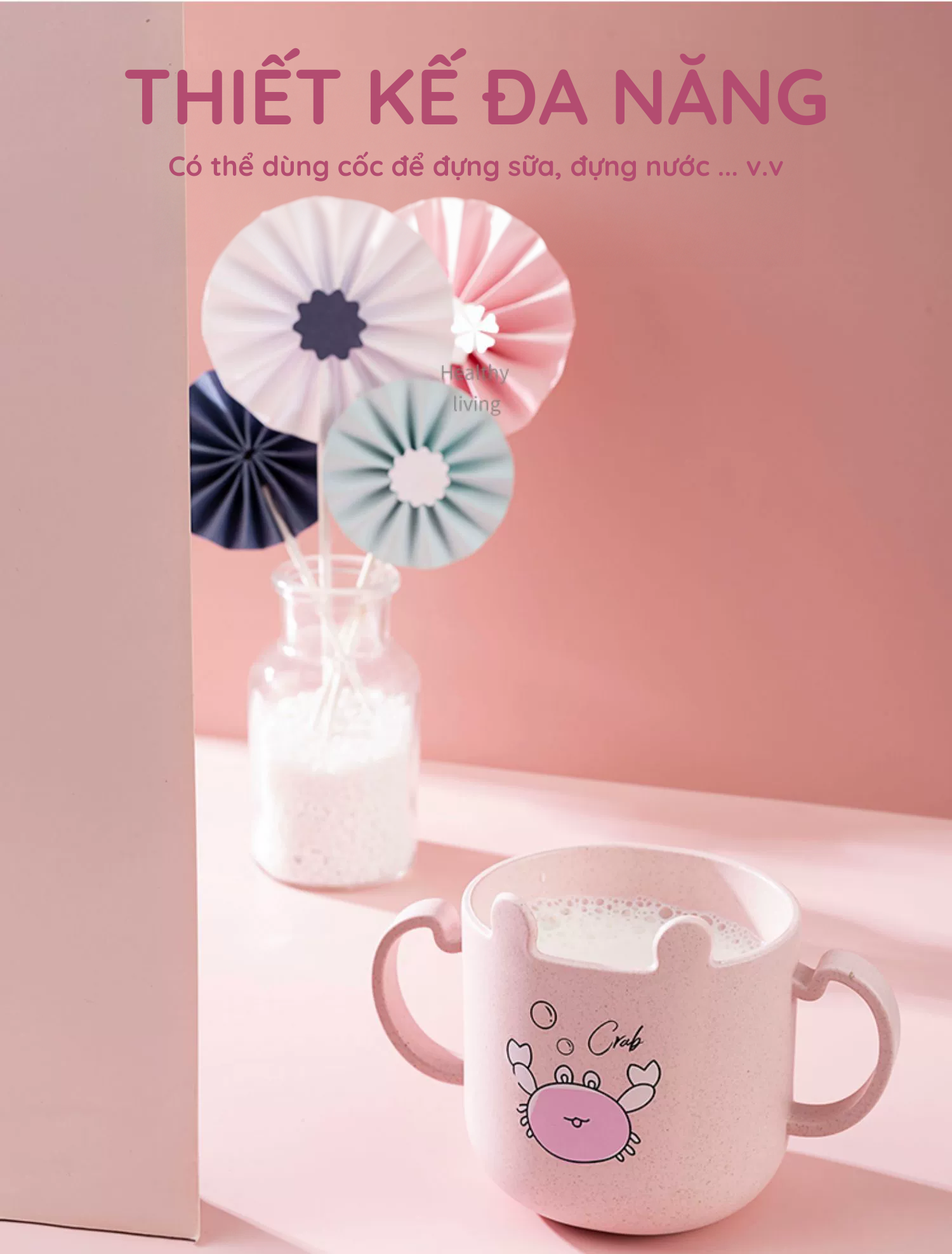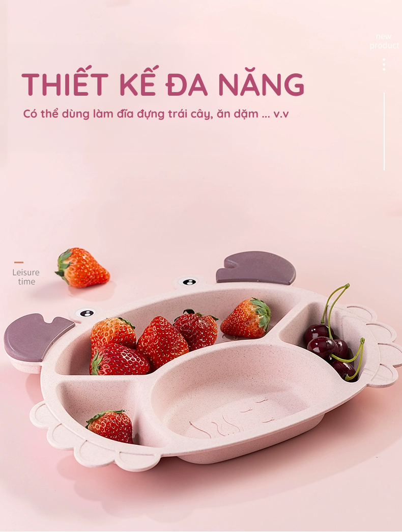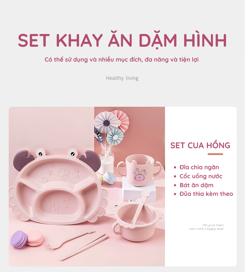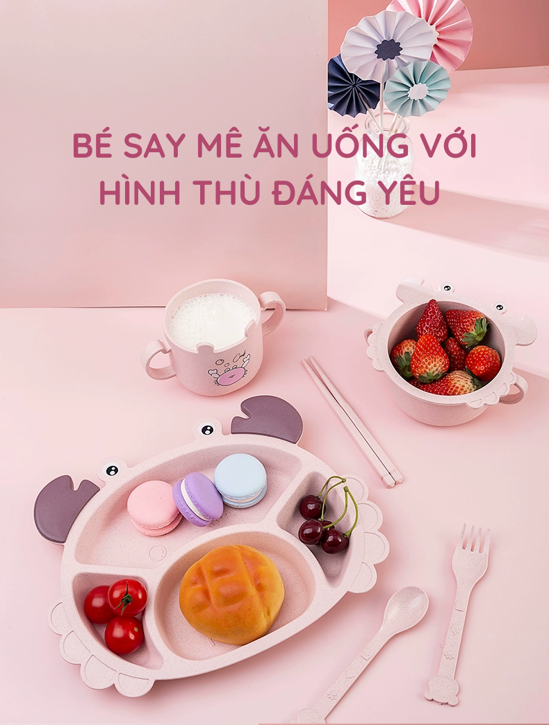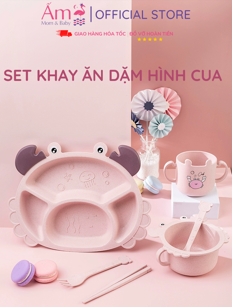 - Set khay ăn dặm nhựa lúa mạch 6 món hình con cua hồng bao gồm khay ăn dặm, thìa, đũa, cốc, và bát là phụ kiện kèm theo.