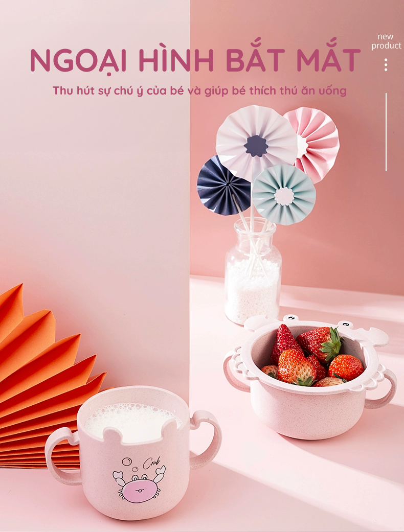 Set Khay Ăn Dặm Lúa Mạch Hình Cua Ấm Baby 6 Món An Toàn Chống Đổ Cho Em Bé Bát Khay Muỗng Ăn Dặm Cho Bé Ấm Gift Decor