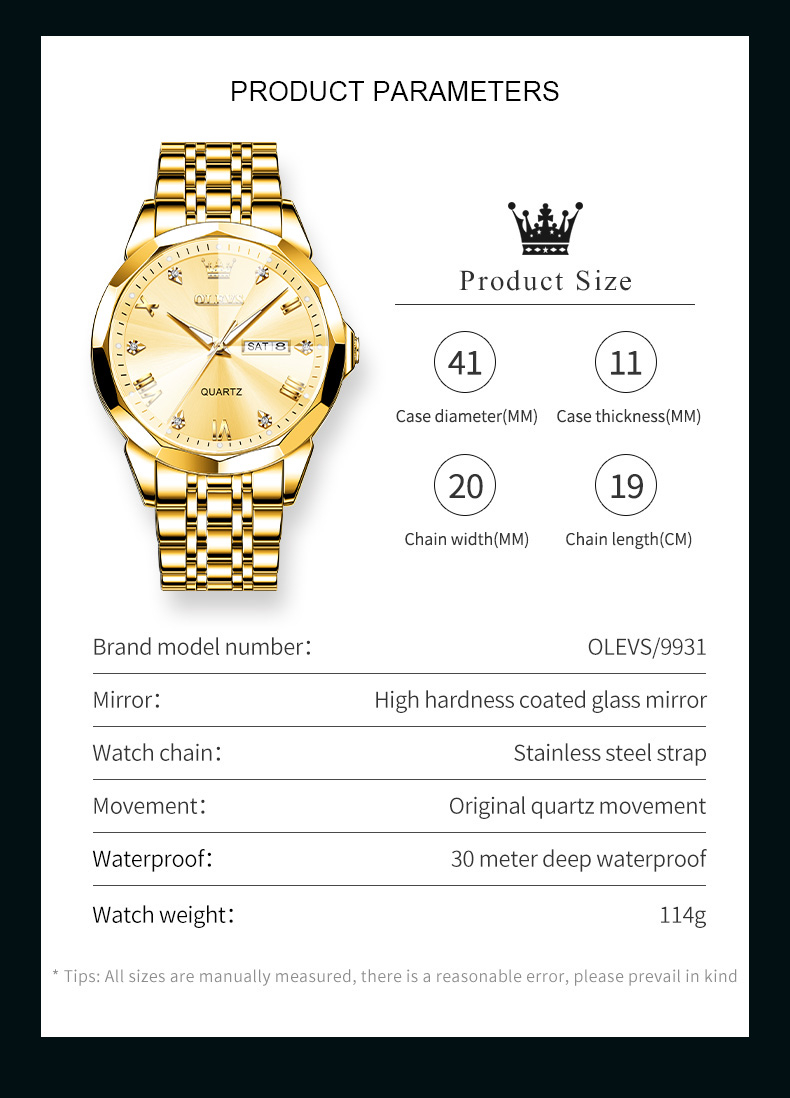 【Bạn thân mến】Chào mừng bạn đến với cửa hàng OLEVS, hy vọng bạn có thể tận hưởng thời gian mua sắm của mình.100% nguyên bản mới, chất lượng cao.Đồng hồ đa chức năng, đồng hồ lịch dạ quang chống thấm nước.Vật liệu:Loại chuyển động: Chuyển động thạch anhLoại khóa: Khóa gấpChất liệu mặt số: kính cường lựcChất liệu vỏ: thép không gỉChất liệu dây đeo: thép không gỉChống nước: 30mSự chỉ rõ:Đường kính vỏ: 41mmĐộ dày đồng hồ: 11mmChiều rộng dây đeo: 20 mmChiều dài dây đeo: 19cmTrọng lượng đồng hồ: 114gSau khi đặt hàng, chúng tôi sẽ kiểm tra cẩn thận sản phẩm trong vòng 24 giờ trước khi giao hàng.Những mặt hàng này thường được chúng tôi gửi qua chuyển phát tiêu chuẩn, mất khoảng 7-10 ngày để đến địa chỉ của bạn.Cửa hàng của chúng tôi hứa rằng chiếc đồng hồ bạn mua bị hư hỏng do các yếu tố không phải con người, vui lòng liên hệ với chúng tôi, chúng tôi sẽ đưa ra câu trả lời thỏa đáng cho bạn.