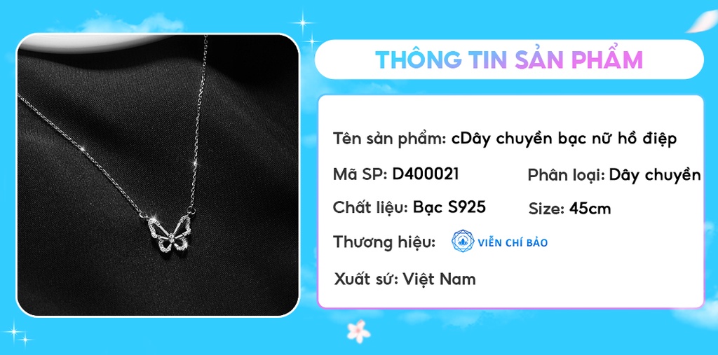 Dây chuyền bạc nữ hồ điệp đính đá chất liệu bạc S925 thời trang phụ kiện trang sức nữ Viễn Chí Bảo D400021