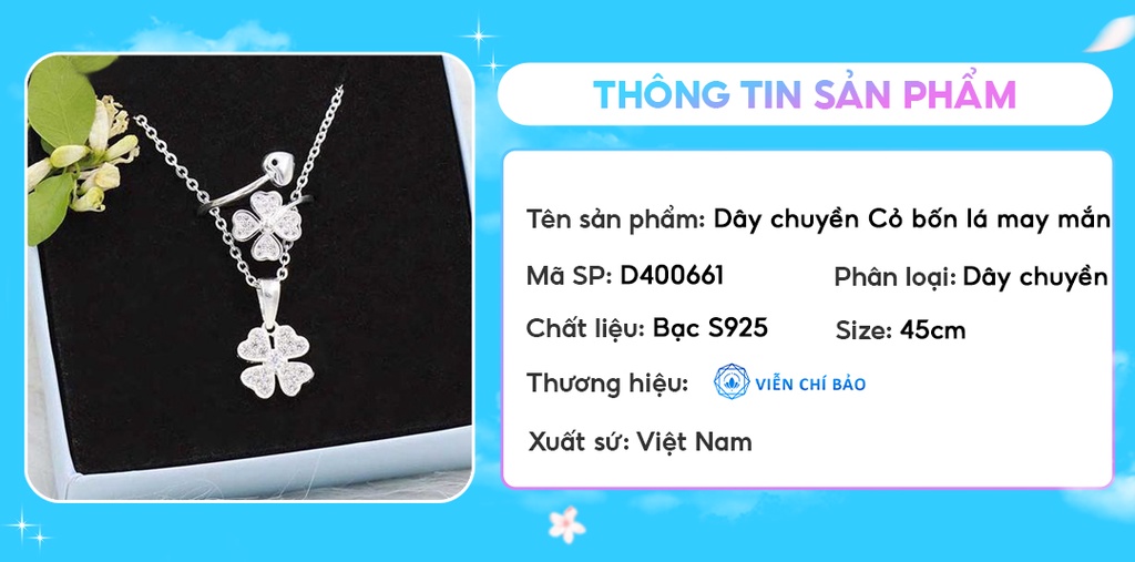 Dây chuyền bạc nữ Cỏ bốn lá may mắn chất liệu bạc 925 thời trang phụ kiện trang sức nữ Viễn Chí Bảo D400661