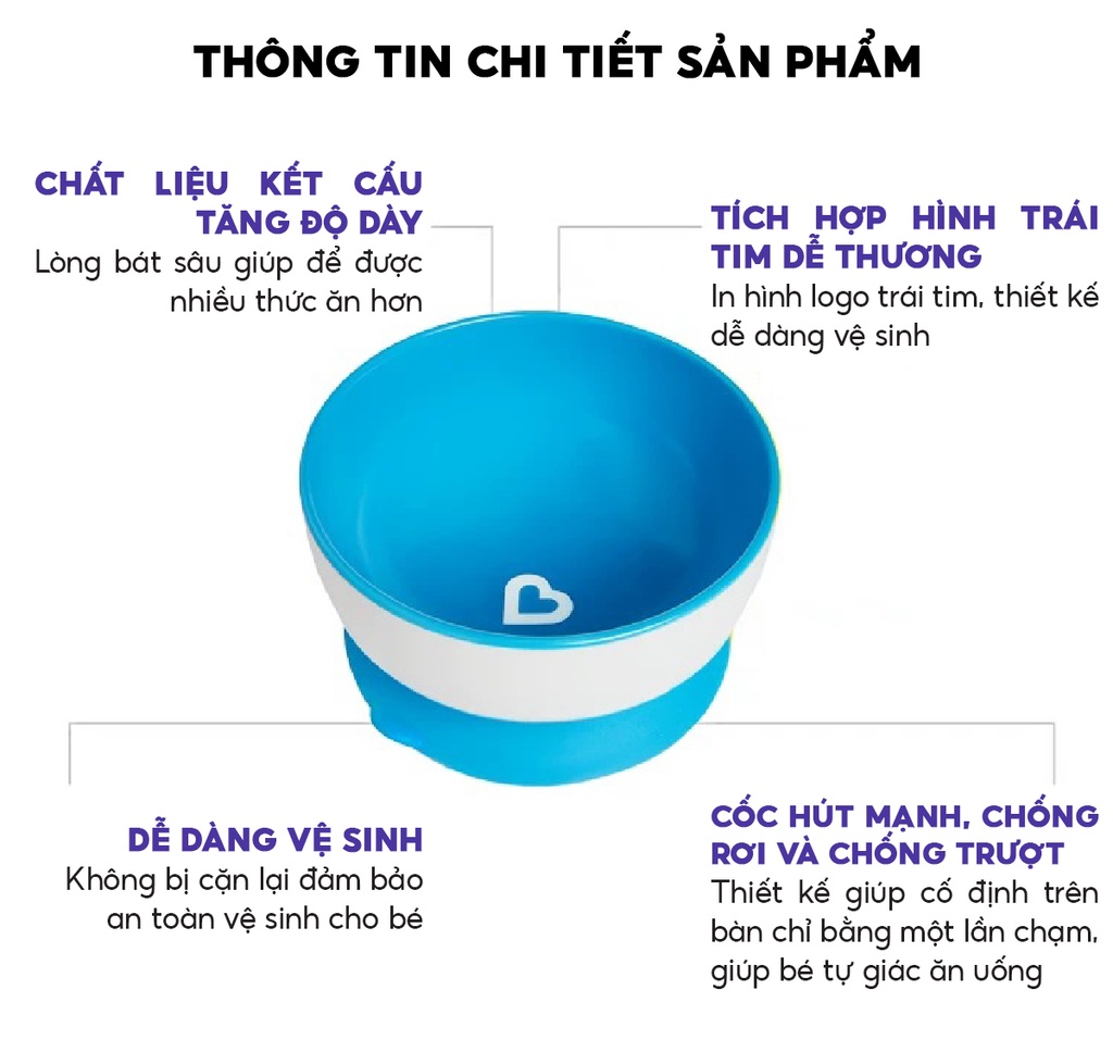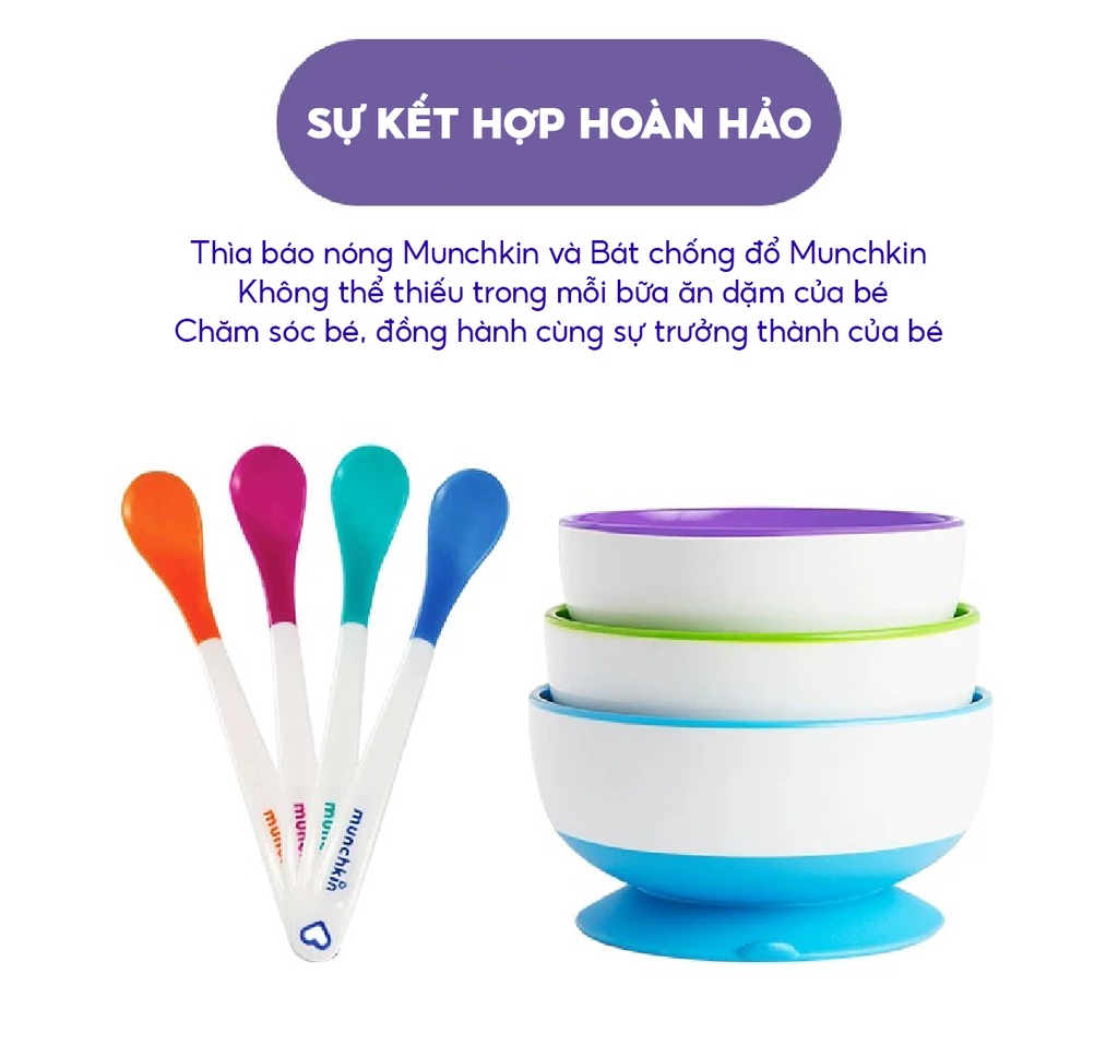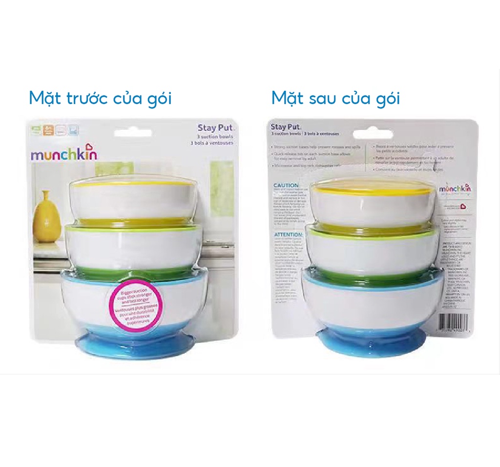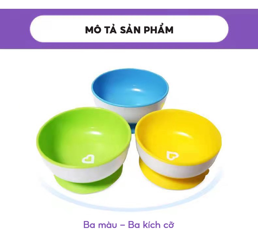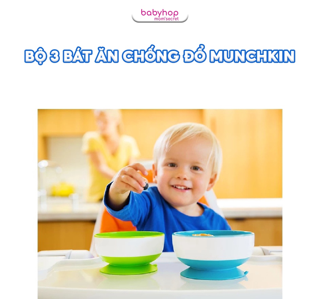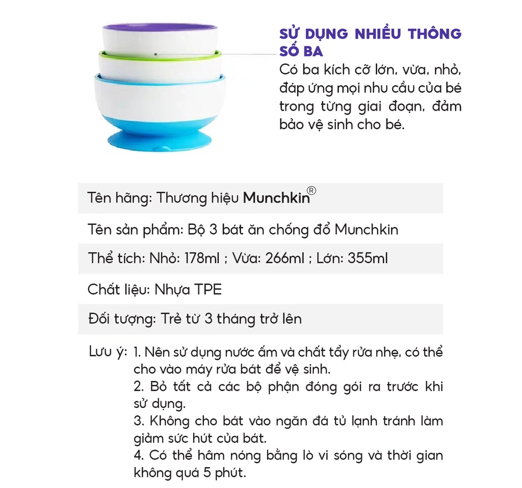 SIZE NHỎ-MÀU VÀNG-ĐƯỜNG KÍNH 10CMSIZE VỪA-MÀU XANH LÁ-ĐƯỜNG KÍNH 11CMSIZE LỚN-MÀU XANH DƯƠNG -ĐƯỜNG KÍNH 12CMBộ ba bát ăn chống đổ Munchkin giúp bé dễ dàng tự ăn mà không lo rơi vãi đồ, đặc biệt phù hợp khi bé mới bắt đầu tập ăn. Với màu sắc bắt mắt và khả năng chống đổ, bộ bát là lựa chọn an toàn khi cho bé ăn dặm.- Đế bát có mút dính chân không chống đổ, tránh làm rơi hoặc đổ bát. Có thể đặt bát ở bất cứ nơi đâu khi cho bé ăn.- Thiết kế sâu lòng, đựng được các loại thức ăn lỏng như bột, cháo…- Phù hợp cho bé từ 6 tháng trở lên.Đặc Điểm Cấu Tạo Bộ 3 Bát Ăn Chống Đổ Munchkin- Bộ 3 bát chống đổ Munchkin được làm từ chất liệu nhựa cao cấp, tuyệt đối an toàn cho sức khỏe của bé khi sử dụng.- Đế bát có đế hút chân không giúp bát bám dính tốt trên tất cả các bề mặt, hạn chế tình trạng đổ bát, rơi vãi thức ăn.3 bát có 3 kích thước khác nhau, thuận tiện đựng đồ ăn theo nhu cầu của bé. Bát có thể xếp chồng lên nhau, giúp tiết kiệm không gian cất trữ.- Thiết kế sâu lòng giúp bé xúc, múc thức ăn dễ dàng hơn.- Bề mặt bát trơn tru, láng mịn nên dễ dàng vệ sinh sau khi sử dụng.- Màu sắc bắt mắt giúp bữa ăn của bé thêm thú vị.Lưu Ý Sử Dụng Bộ 3 Bát Ăn Chống Đổ Munchkin- Không sử dụng sản phẩm cho lò vi sóng.- Không được luộc hay tiệt trùng bằng hơi.- An toàn với trên cùng của máy rửa bát.