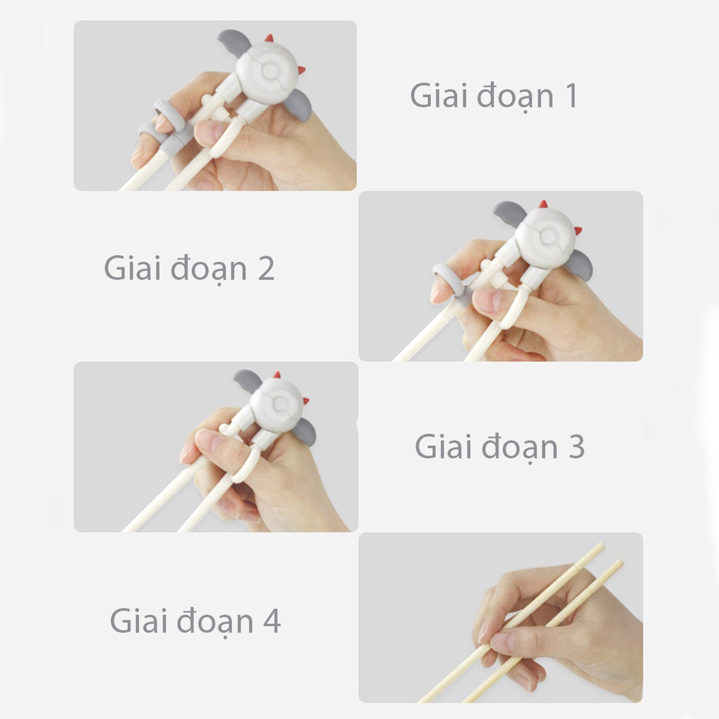 Đũa tập ăn được thiết kế bằng nhựa ABS, không BPA an toàn tuyệt đối cho bé.Đũa tập ăn được thiết kế với 3 vòng giúp cố định ngón tay, 2 vòng ngón trỏ và giữa bằng silicon mềm, vòng ngón cái bằng nhựa ABS.Đũa tập ăn thiết kế cố định phần đầu trên giúp bé cầm đũa dễ dàng hơn.Đũa tập ăn với phần đầu thiết kế bè to, chống trơn trượt giúp bé dễ dàng gắp thức ăn.Đũa tập ăn có một vai trò to lớn trong việc hướng dẫn trẻ thành thạo tư thế cầm bút chính xác trong giai đoạn phát triển sau này.✔️Cách sử dụng qua từng giai đoạn: