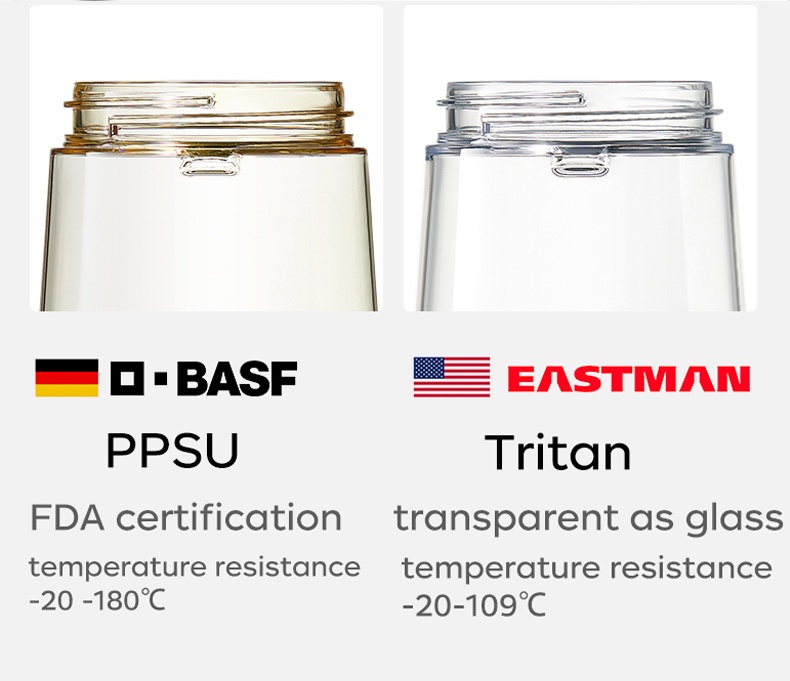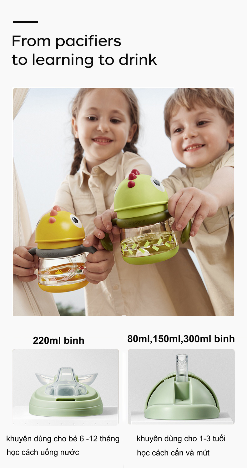 * 220ml là thiết kế đặc biệt cho bé từ 6 tháng trở lên, ống hút khác biệt, có thể giúp bé tập bú Chai 80ml, 150ml, 300ml, ống hút được thiết kế đặc biệt cho bé trên 12 tháng* Chỉ có chai 300ml là có dây đeo, các chai kích thước khác là loại có tay cầm* Mẹo: PPSU chịu nhiệt độ -20-180°C, Tritan chịu nhiệt độ -20-109°C. Thân ppsu hơi vàng, thân tritan trong suốt.