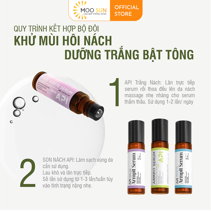 - Serum API giảm thâm nách với kết cấu lỏng nhẹ, khô thấm nhanh giúp giảm thâm vùng nách, giúp da trắng, sáng đều màu hơn, làm mịn da và thu nhỏ lỗ chân lông.
