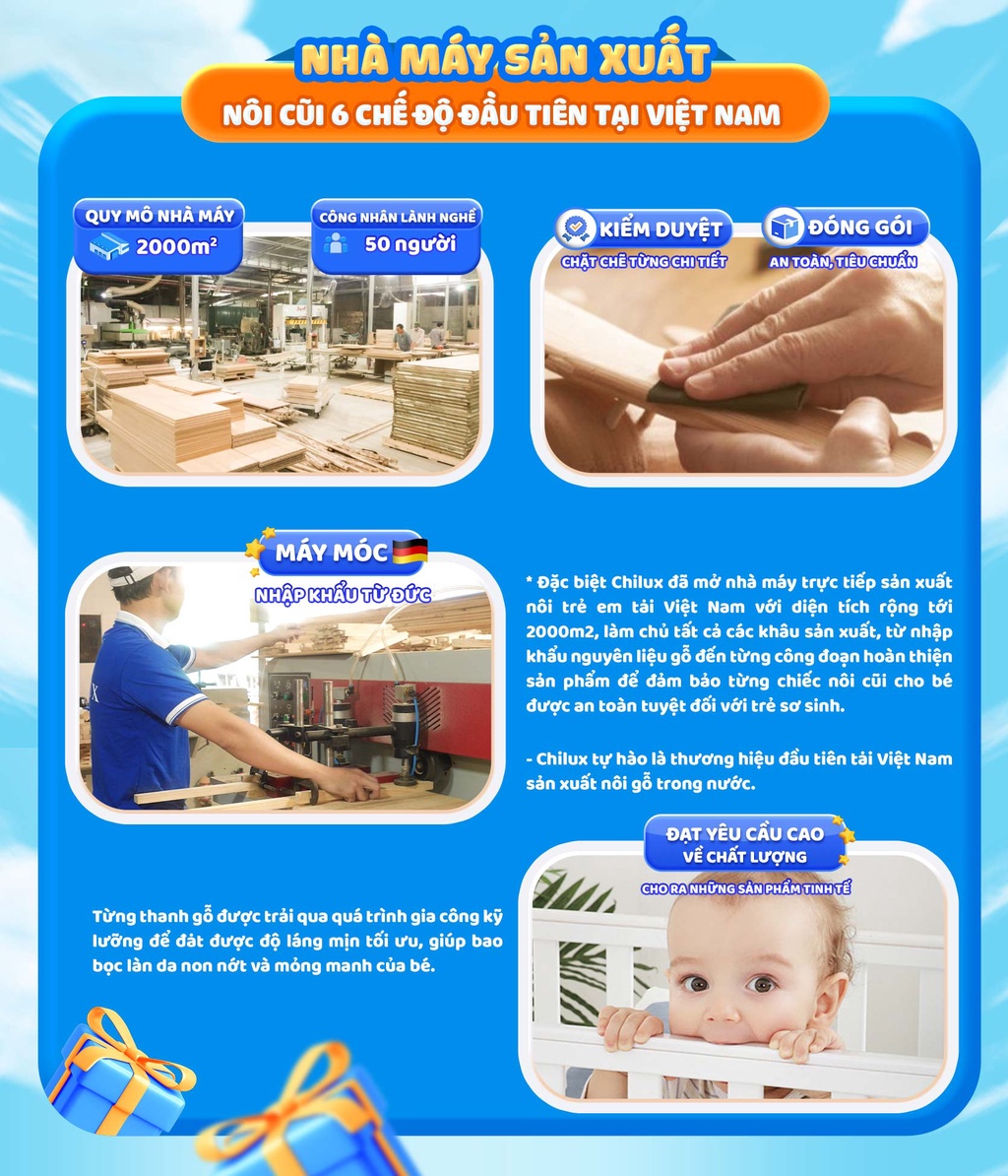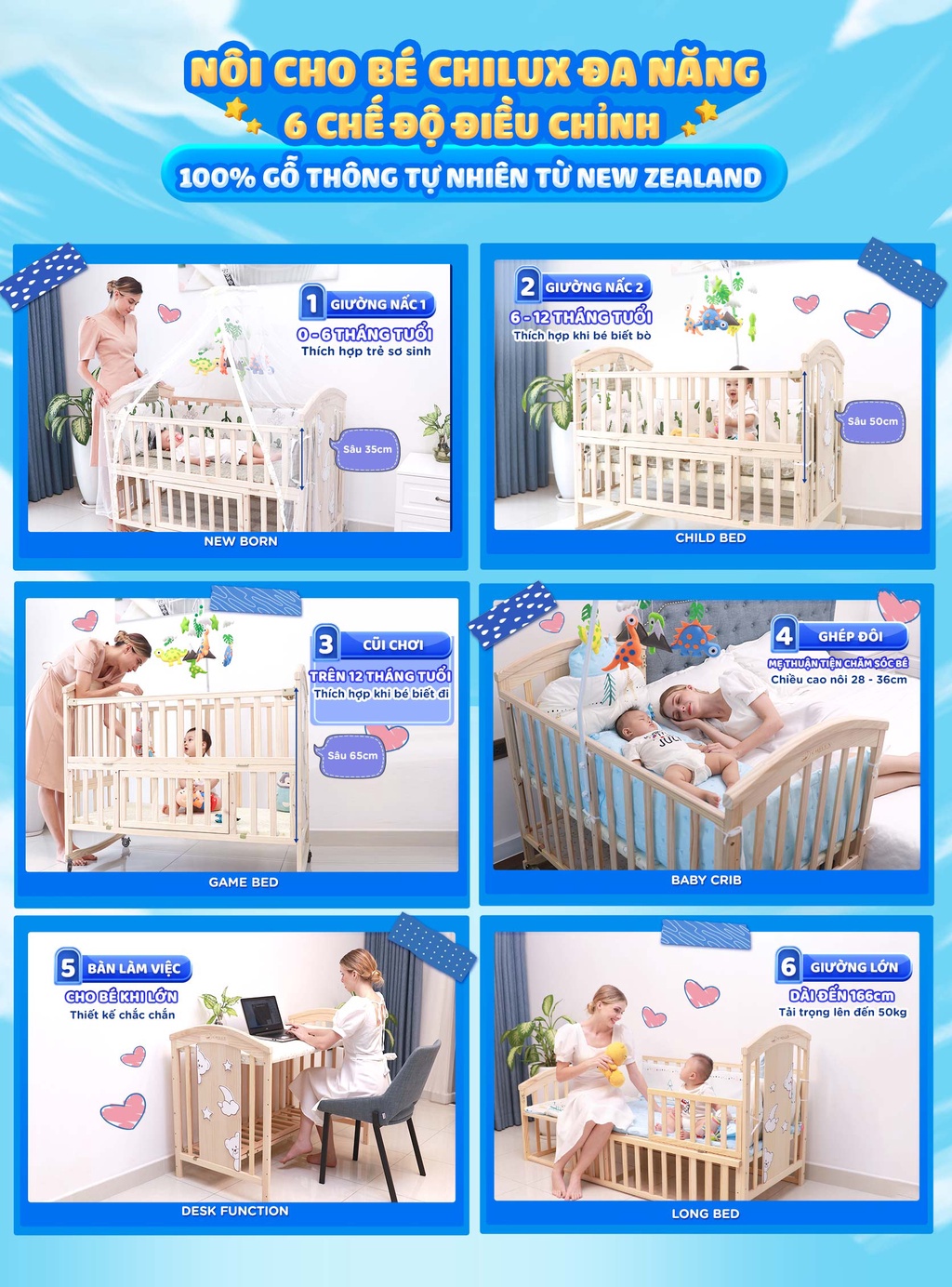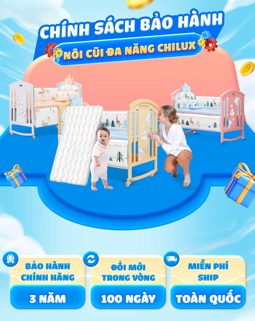 1.Vì sao bố mẹ nên mua cũi cho bé sử dụng trong những năm tháng đầu đời?- Bé được ngủ riêng trong cũi từ sớm sẽ không bị quện hơi mẹ, không phụ thuộc vào người lớn, tránh thói quen xấu như liên tục đòi bé, bú lặt vặt, bám mẹ không rời.- Khi bé lớn bắt đầu lật, bò, đứng, vịn hay chơi đùa nhìu hơn thì chiếc cũi cho bé sẽ là trợ thủ đắc lực của bố mẹ, vừa đảm bảo an toàn cho bé vừa rèn luyện được thói quen ngủ độc lập trong chiếc cũi xinh xắn của riêng mình.- Chiếc cũi cho bé còn giúp mẹ thảnh thơi hơn, vừa chăm sóc gia đình vừa chăm con một cách khoa học. Củi cho bé được trang bị những chức năng tiện lợi như chế độ bập bênh ru bé ngủ, chế độ bánh xe có thể đẩy bé đi khắp nhà theo chân của mẹ. Giờ đây việc trông con sẽ dễ dàng hơn nhờ chiếc cũi em bé đa năng này.- Ngoài ra chiếc cũi em bé còn có thể chuyển đổi thành giường lớn và ghép sát vào giường của bố mẹ, bố mẹ sẽ tiện hơn trong việc chăm sóc bé khi ngủ đặc biệt là vào ban đêm.- Một điểm cộng thêm cho chiếc cũi trẻ em là được thiết kế đẹp mắt kết hợp với màu gỗ tự nhiên tạo nên tổng thể hài hoà có thể trang trí cho không gian căn nhà- Hơn nữa, thời gian sử dụng cũi trẻ em thường kéo dài từ 5 – 10 năm, rất tiết kiệm, an toàn, tiện lợi.2. Nôi cho bé Chilux sự lựa chọn hàng đầu cho mẹ và bé* Nôi cho bé chilux đa năng 6 chế độ đồng hành cùng con từ 0 tháng tuổi đến tận 12 tuổi. + Chế độ giường 1 sâu 35cm dành cho bé từ 0 – 6 tháng tuổiỞ độ tuổi còn sơ sinh thì con chủ yếu nằm ngủ và chơi với mẹ, chính vì vậy nên sử dụng nôi cho bé ở chế độ này để thuận tiện cho việc chăm bé, dễ dàng thay tã. Ở chiều sâu này chúng ta tận dụng được ngăn dưới của nôi để đựng các vật dụng cần thiết cho bé khi cần. Có cửa đóng mở dễ dàng bằng nút bấm.+ Chế độ giường 2 sâu 50cm dành cho bé từ 6 – 12 tháng tuổiBé với tháng tuổi này đã tinh nghịch hơn và bắt đầu tập lật, tập bò nên bố/mẹ điều chỉnh nôi ở nấc này. Sẽ yên tâm hơn cho bé thoải mái tập lật trong nôi nhé. + Chế độ giường 3 sâu 65cm dành cho bé từ 12-36 tháng tuổiỞ độ tuổi trên 1 năm này bé đã lớn và đang trong tuổi tập đứng, tập đi, thích khám phá, nghịch nghợm nên các mẹ hạ chiếc nôi gỗ ở chế độ 3 để phù hợp với chiều cao của bé, giúp bé chơi trong nôi thoải mái hơn.+ Chế độ ghép đôi giường với bố mẹCó thể điều chỉnh chiều cao của nôi đa năng linh hoạt từ 28cm đến 60cm. Giúp mẹ có thể quan sát bé yêu mỗi tối, ngắm nhìn được bé ngủ say và ngon giấc.+ Chế độ giường cũi lớn cho bé từ 3 tuổi trở lênChức năng đặc biệt của chiếc nôi cho bé này là đem đến sự tiện lợi và tiết kiệm về lâu dài: Có thể kéo thành giường dài lên đến 1m6 để phù hợp cho bé nằm một cách thoải mái. + Bàn làm việc, bàn học khi bé lớnMột chiếc bàn xinh xắn và đủ chắc chắn sẽ được chuyển khi bé lớn.* Hiện nay ở Việt Nam, nôi cho bé sơ sinh với chất liệu gỗ được ba mẹ ưa chuộng lựa chọn hơn hết bởi sự an toàn và sang trọng, chilux lựa chọn gỗ thông nhập khẩu 100% từ New Zealand đạt tất cả tiêu chuẩn an toàn.– Có độ cứng cao, kết cấu cực kỳ chắc chắn.– Gỗ tự nhiên có tuổi thọ cao vì vậy sản phẩm rất bền và an toàn.– Có khả năng chống côn trùng, mối mọt.– Khả năng chịu ẩm tốt, ít bị nứt nẻ khi tiếp xúc với ánh mặt trời.– Đặc biệt, màu sắc tự nhiên đẹp đẽ, sang trọng và bắt mắt.* Nôi em bé Chilux được thiết kế theo tiêu chuẩn Châu Âu, đảm bảo an toàn về các thông số như khoảng cách các khung cũi 5.5cm tránh trường hợp bé bị kẹt tay, độ tiện lợi khi có thể linh hoạt biến thành giường ngủ, bàn học, nôi bập bênh.* Đặc biệt Chilux đã mở nhà máy trực tiếp sản xuất nôi trẻ em tại Việt Nam với diện tích rộng tới 2000m2, làm chủ tất cả các khâu sản xuất, từ nhập khẩu nguyên liệu gỗ đến từng công đoạn hoàn thiện sản phẩm để đảm bảo từng chiếc nôi cũi cho bé được an toàn tuyệt đối với trẻ sơ sinh3.Tiêu chí khi chọn lựa nôi cũi, giường cũi cho bé Kích cỡ: Bố mẹ nên chọn những loại nôi cũi, giường cũi cho bé không nên quá lớn cũng không nên quá nhỏ phù hợp nhất cho bé sử dụng cho đến khi lớn, thì kích thước chuẩn của chilux là sự lựa chọn hoàn hảo nhất.#noicui #noiembe #noichobe #giườngcũi #cũichobésơsinh #NoicuiChilux #NoicuichobeChilux #NoiembeChilux #cũichobé #noicui #cuigo #giuo