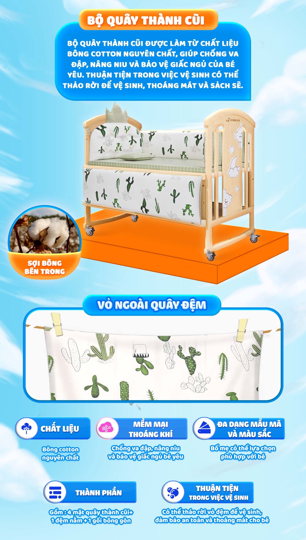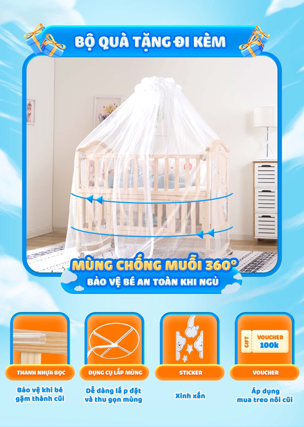 ?Có 6 option để ba mẹ lựa chọn, chất liệu cũi và tính năng là như nhau, chỉ khác phụ kiện đi kèm của từng option -Combo 1: Nôi Không-Combo 2: Nôi + Đệm Xơ Dừa-Combo 3: Nôi + Quây Cotton-Combo 4: Nôi + Quây Hoàng Gia-Combo5: Nôi + Quây Muslin-Combo 6: Trọn Bộ Cotton (Gồm: Nôi + Đệm Xơ Dừa +Quây Cotton)-Combo 7: Trọn Bộ Hoàng Gia (Gồm: Nôi + Đệm Xơ Dừa + Quây Hoàng Gia)-Combo8: Trọn Bộ Muslin (Gồm: Nôi + Đệm Xơ Dừa + Quây Muslin)