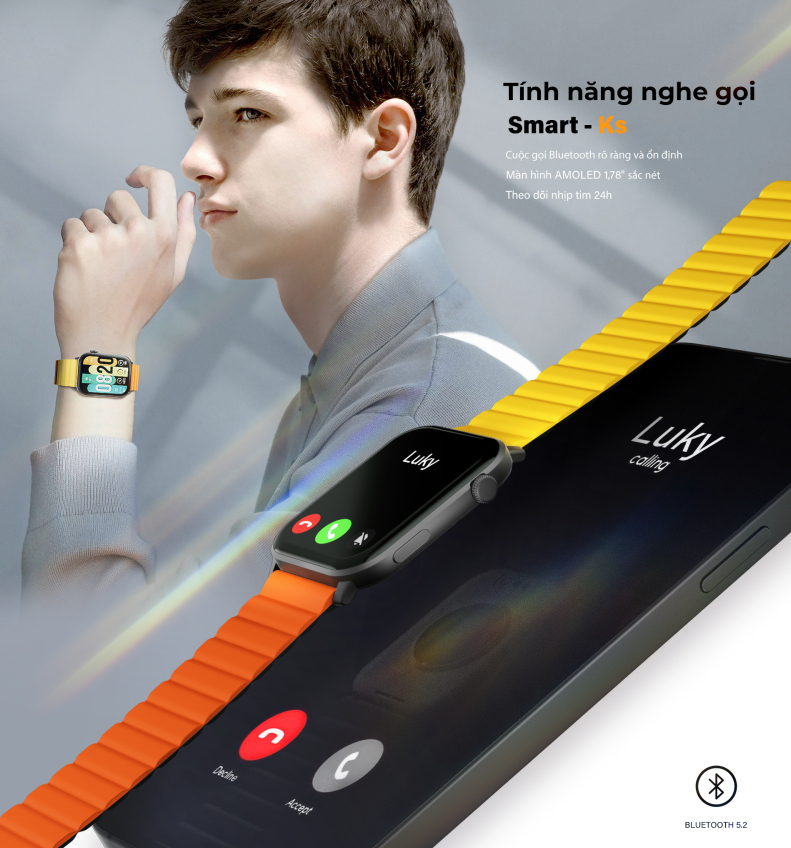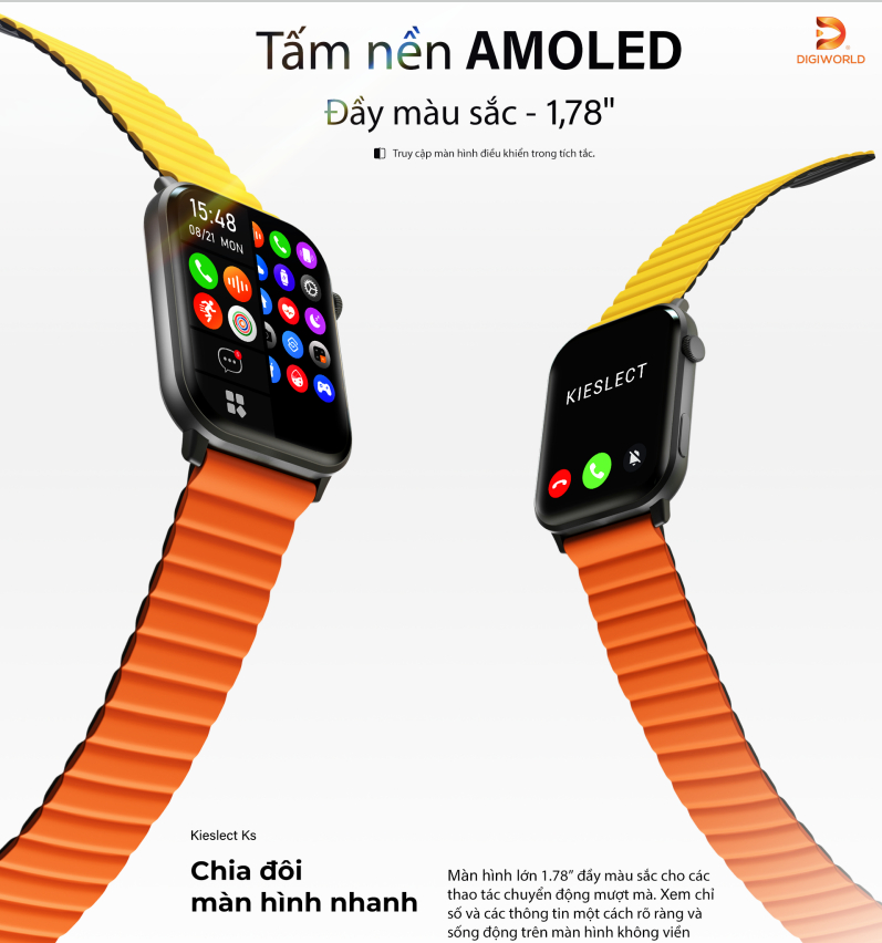 ĐẶC ĐIỂM NỔI BẬTMàn hình AMOLED 1.78 inch độ phân giải 368 x 448 pixels sắc nétTích hợp hơn 100 chế độ tập luyện thể thao, bài tập nâng caoTheo dõi chính xác chỉ số nhịp tim, SPO2, mức độ căng thẳng, theo dõi giấc ngủ,...Thời lượng pin lên đến 10 ngày ở chế độ tiết kiệm pinHỗ trợ nghe gọi trên đồng hồ cực tiện lợiĐồng hồ Kieslect Ks - Tính năng nghe gọi trên đồng hồ thông minhĐồng hồ thông minh Kieslect Ks là sản phẩm mới mang đến nhiều nâng cấp đáng giá hơn so với với Kr và Kr Pro. Mẫu đồng hồ Kieslect này sẽ tích hợp khả năng nghe gọi trực tiếp ngay trên đồng hồ, với tính năng tích hợp nhận và trả lời cuộc gọi trên đồng hồ. Cùng với sự hỗ trợ của trợ lý ảo toàn năng và tính năng màn hình luôn bật giúp bạn trải nghiệm thêm thú vị.Thiết kế thể thao với màn hình Ultra AMOLED Kieslect Ks được làm theo phong cách thể thao nhưng sang trọng hơn hẳn với dây đeo đa màu sắc thời trang. Khung viền của đồng hồ được làm từ hợp kim nguyên khối có nút xoay giúp điều chỉnh và ở đáy có tích hợp cảm biến theo dõi chỉ số sức khỏe thông minh.Phiên bản Kieslect Ks lần này sẽ được trang bị màn hình Ultra AMOLED với kích thước được nâng cấp lên đến 1.78 inch. Màn hình lớn hơn cùng với độ phân giải cao nên mọi nội dung được hiển thị rực rỡ, viền mỏng càng khiến không gian thêm mở rộng mãn nhãn. Tích hợp Always On Display, nghe gọi trực tiếpBên cạnh không gian lớn hơn thì màn hình của smartwatch Kieslect Ks còn được trang bị tính năng Always On Display. Ngoài ra, với Kieslect Ks người dùng còn có thể gọi hoặc nhận cuộc gọi trực tiếp trên đồng hồ và micro. Cùng với đó là trang bị kết nối Bluetooth 5.2 mới, nên có thể hỗ trợ cuộc gọi bluetooth nhanh chóng.