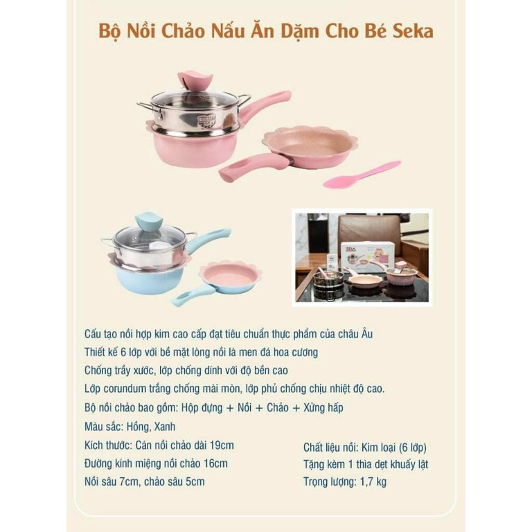 -------------------? Thông số kỹ thuật bộ nồi chảo ăn dặm SEKA:Trọng lượng: 1.7kgKích thước: Nồi Cán dài 19cm, Miệng 16cm, Sâu 7cm, xửng hấp 16cm, chảo sâu 5cmBộ nồi bao gồm: Hộp đựng + Nồi hấp (19*16*7cm - Cán * Miệng * Sâu) + chảo + Xửng hấp + 1 thìa dẹt khuấy lật chuyên nghiệp Chất liệu nồi: Đá Maifan, xửng inoxMàu sắc: màu hồng, màu xanh