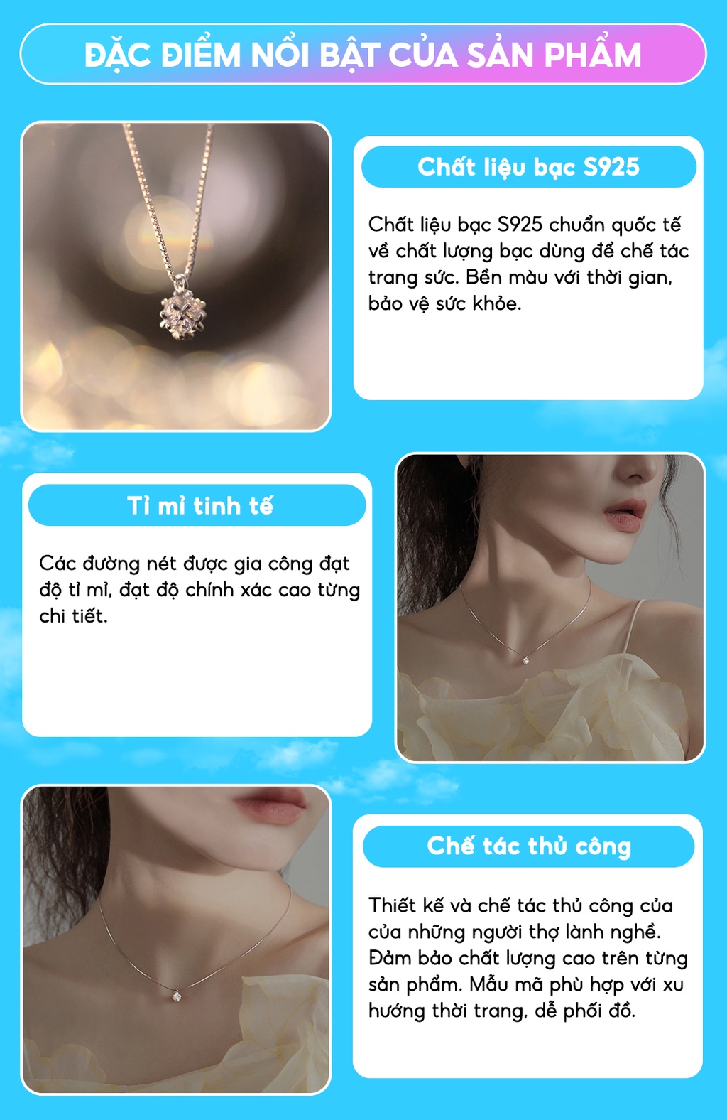 - Sản xuất: Vòng cổ bạc nữ được sản xuất trực tiếp tại xưởng Việt Nam hoặc nhập khẩu.